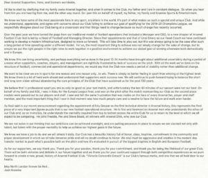 വ്യാപകമായ ആരാധക രോഷത്തിനൊടുവിൽ ടീം ഓണർ സ്റ്റാൻ ക്രൊയേങ്കയുടെ മകൻ ജോഷ് ആര്സെനലിനോടുള്ള തങ്ങളുടെ ആരാധനയും ഉത്തരവാദിത്തവും ഏറ്റുപറഞ്ഞുകൊണ്ടുള്ള ഒരു തുറന്ന കത്ത് എഴുതുകയുണ്ടായി. ട്രാൻസ്ഫർ മാർക്കറ്റ് അവസാന ഘട്ടത്തിലേക്ക് എത്തിനിൽക്കവേ വലിയ അത്ഭുതങ്ങൾ ഒന്നും ആരാധകർ പ്രതീക്ഷിക്കുന്നില്ലെങ്കിലും ആരാധകരോഷം തണുപ്പിക്കാൻ ഒരു മികച്ച സൈനിങ് എങ്കിലും ഉറപ്പിക്കാൻ വേണ്ട ഇടപെടലുകൾ മാനേജ്മെന്റ് നടത്തും എന്ന് പ്രതീക്ഷിക്കാം.