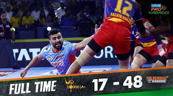 ഹൈദരാബാദ്: 2019 പ്രൊ കബഡി ലീഗിൽ ഇന്നലെ നടന്ന ആദ്യ മത്സരത്തിൽ ബംഗാൾ വാരിയേഴ്സ് യുപി യോദ്ധയെ തോൽപ്പിച്ചു. തകർപ്പൻ ജയമാണ് ബംഗാൾ വാരിയേഴ്സ് നേടിയത്.48-17 എന്ന സ്കോറിലാണ് ബംഗാൾ യുപി യോദ്ധയെ തോൽപിച്ചത്. ബംഗാൾ വാരിയേഴ്സിനായി മുഹമ്മദ് നബിബക്ഷ് അരങ്ങേറ്റ മത്സരത്തിൽ സൂപ്പർ 10 നേടി. മികച്ച പ്രകടനമാണ് ബംഗാൾ നടത്തിയത്.