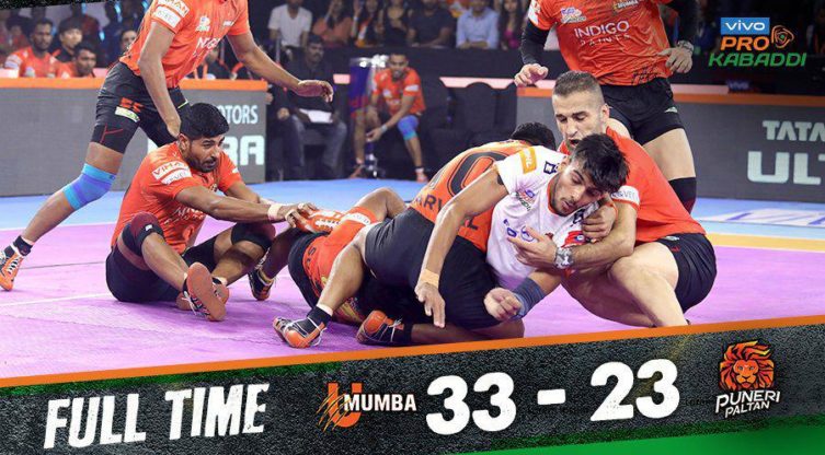 2019 പ്രൊ കബഡി ലീഗിൽ ഇന്ന് നടന്ന മത്സരത്തിൽ പുനേരി പൽത്താനെ 33-23 എന്ന സ്കോറിൽ യു മുംബൈ തോൽപ്പിച്ചു. കിടിലൻ പ്രകടനമാണ് യു മുംബൈ കാഴ്ചവെച്ചത്. ജയത്തോടെ ഏഴാം സീസണിലെ രണ്ടാം ജയം മുംബൈ സ്വന്തമാക്കി. പത്ത് പോയിന്റ് വ്യത്യാസത്തിലാണ് മുംബൈ ജയിച്ചത്.