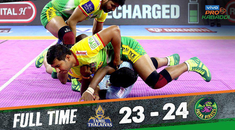 തമിഴ് തലൈവയും പട്ന പൈറേറ്റ്സും തമ്മിലുള്ള പ്രൊ കബഡി ലീഗിലെ പതിനാറാമത്തെ  മത്സരത്തിൽ തമിഴ് തലൈവസിനെ പട്ന പൈറേറ്റ്സ് തോൽപ്പിച്ചു. 24-23ന് എന്ന സ്കോറിനാണ് പട്‌ന പൈറേറ്റ്സ് വിവോ പ്രോ കബഡി സീസൺ 7 ന്റെ രണ്ടാം ജയം സ്വന്തമാക്കിയത്. മഞ്ജീത് ചില്ലാർ നടത്തിയ വിജയകരമായ രണ്ട് ടാക്കിളുകളും അജയ് ‘ഐസ്മാൻ’ താക്കൂർ, രാഹുൽ ‘ഷോമാൻ’ ചൗധരി എന്നിവരുടെ വിജയകരമായ റെയ്ഡുകളും തമിഴ് തലൈവാസിനെ  ആദ്യം 4-0ന് മുന്നിലെത്തിച്ചു. ജയ്ദീപിന്റെ ഒരു സൂപ്പർ ടാക്കിളിന് പട്ന പൈറേറ്റ്സിന്റെ സ്കോർബോർഡ് ചലിക്കാൻ തുടങ്ങി. പിന്നീട് രണ്ട് ടീമുകളും ഒപ്പത്തിനൊപ്പം ആയിരുന്നു സ്‌കോർ നേടിക്കൊണ്ടിരുന്നത്. ആദ്യ പകുതിയുടെ അവസാന 10 മിനിറ്റുകളിൽ ഇരു ടീമുകളും അപകടസാധ്യതകൾ പരിമിതപ്പെടുത്തുകയും ഡു ഓർ ഡൈ സാഹചര്യങ്ങളിൽ നിന്ന് പോയിന്റുകൾ നേടി. ആദ്യ പകുതിയിൽ രണ്ട് ടീമുകളും 11-11 എന്ന സ്‌കോറിൽ ആണ് പിരിഞ്ഞത്.