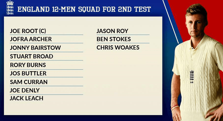 ഇംഗ്ലണ്ട് ടീം: ജോ റൂട്ട് , ജോഫ്ര ആർച്ചർ, ജോണി ബെയർസ്റ്റോ, സ്റ്റുവർട്ട് ബ്രോഡ്, റോറി ബേൺസ്, ജോസ് ബട്ലർ, സാം കുറാൻ, ജോ ഡെൻലി, ജാക്ക് ലീച്ച്, ജേസൺ റോയ്, ബെൻ സ്റ്റോക്സ്, ക്രിസ് വോക്സ്