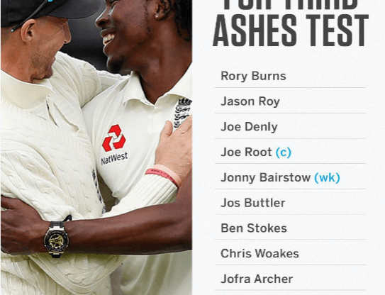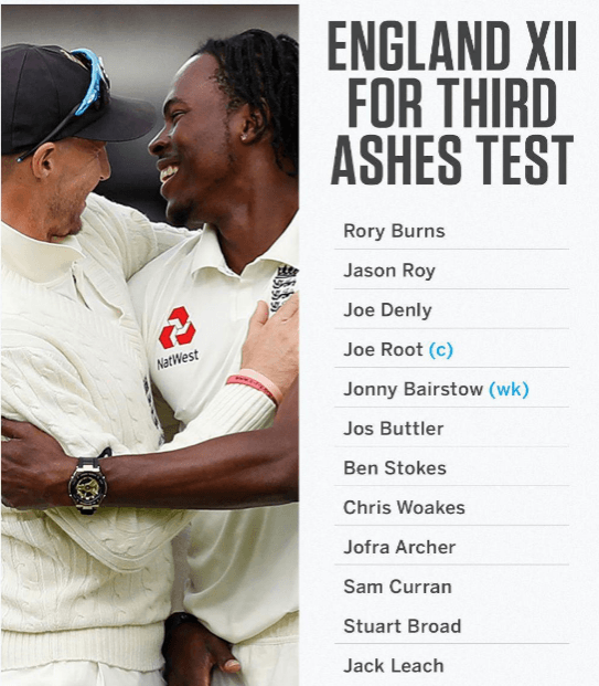 മൂന്നാം ആഷസ് ടെസ്റ്റിനുള്ള പന്ത്രണ്ടംഗ ഇംഗ്ലണ്ട് ടീമിനെ പ്രഖ്യാപിച്ചു. രണ്ടാം മത്സരം സമനിലയിൽ അവസാനിച്ചിരുന്നു. രണ്ടാം മൽസരത്തിൽ ഉള്ള താരങ്ങൾ തന്നെയാണ് മൂന്നാം മൽസരത്തിന് ഉള്ളത്. ടീമിൽ മാറ്റം ഒന്നും വരുത്തിയിട്ടില്ല. ജെയിംസ് ആൻഡേഴ്സൺ പരിക്ക് മൂലം ആഷസിൽ നിന്ന് നേരത്തെ പുറത്തായി. ആർച്ചർ ടീമിൽ ഇടം നിലനിർത്തി.
