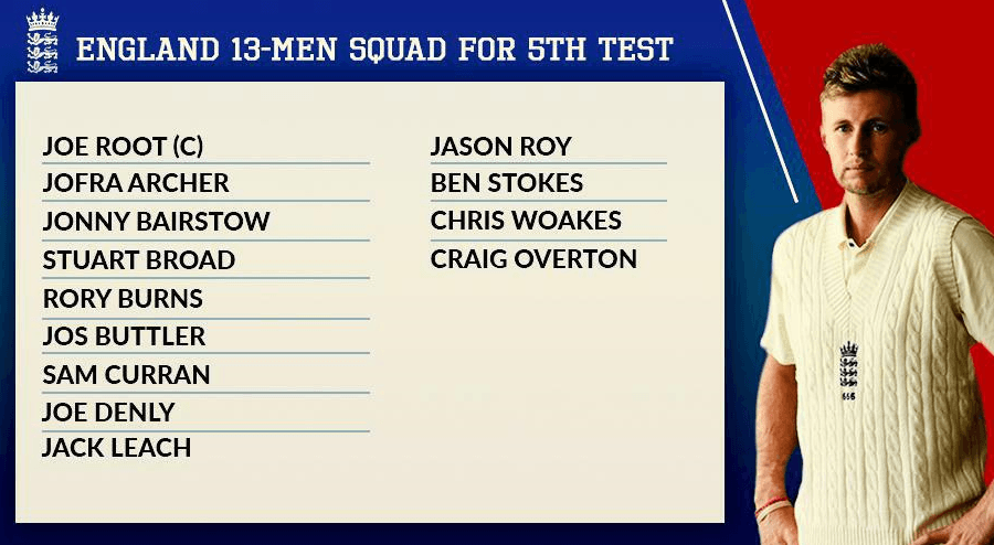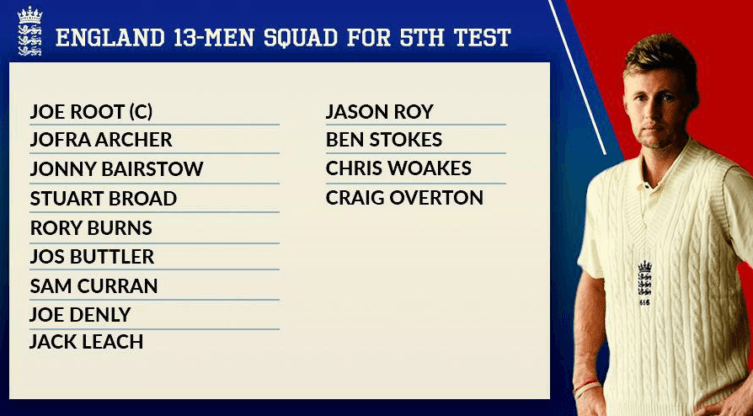 അഞ്ചാം ടെസ്റ്റിനുള്ള ഇംഗ്ലണ്ട് ടീം: ജോ റൂട്ട്, ജോഫ്ര ആർച്ചർ, ജോണി ബെയർ‌സ്റ്റോ, സ്റ്റുവർട്ട് ബ്രോഡ്, റോറി ബേൺസ്, ജോസ് ബട്‌ലർ (ആഴ്ച), സാം കുറാൻ, ജോ ഡെൻലി, ജാക്ക് ലീച്ച്, ക്രെയ്ഗ് ഓവർട്ടൺ, ജേസൺ റോയ്, ബെൻ സ്റ്റോക്സ് , ക്രിസ് വോക്സ്.