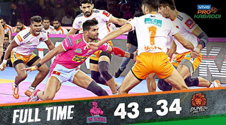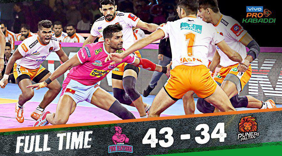 ഇന്നലെ നടന്ന വിവോ പ്രൊ കബഡി ലീഗിലെ രണ്ടാം മൽസരത്തിൽ ജയ്പൂർ പിങ്ക് പാന്തേഴ്സ് പുനേരി പൽത്താനെ തോൽപ്പിച്ചു. ജയ്പ്പൂർ പിങ്ക് പാന്തേഴ്സിൻറെ ഈ സീസണിലെ ഒൻപതാം വിജയമാണ് ഇന്നലെ നേടിയത്. ജയ്പൂരിലെ സവായ് മാൻസിംഗ് സ്റ്റേഡിയത്തിൽ നടന്ന മൽസരത്തിൽ 43-34 എന്ന സ്കോറിനാണ് അവർ പുനേരി പൽത്താനെ തോൽപ്പിച്ചത്. ജയ്പൂർ പിങ്ക് പാന്തേഴ്സിനായി ദീപക് ഹൂഡയും ദീപക് നർവാളും സൂപ്പർ 10 നേടുകയും ചെയ്തു.മത്സരത്തിൽ തുടക്കം മുതൽ ആക്രമിച്ചു കളിച്ച ജയ്പ്പൂർ തുടക്കത്തിൽ തന്നെ പുനേരിയെ ഓൾഔട്ടാക്കി. ഓൾഔട്ടിനുശേഷം കൂടുതൽ ആക്രമണോത്സുകതയോടെ കളിച്ച പുനേരി പൽത്താൻ മുമ്പത്തേതിനേക്കാൾ കൂടുതൽ സ്വതന്ത്രമായി പോയിന്റുകൾ നേടാൻ തുടങ്ങി. എന്നിരുന്നാലും, ഹൂഡയും സാലുങ്കെയും പുനേരിയുടെ പ്രതിരോധത്തിനെതിരെ മികച്ച പ്രകടനം നടത്തി.