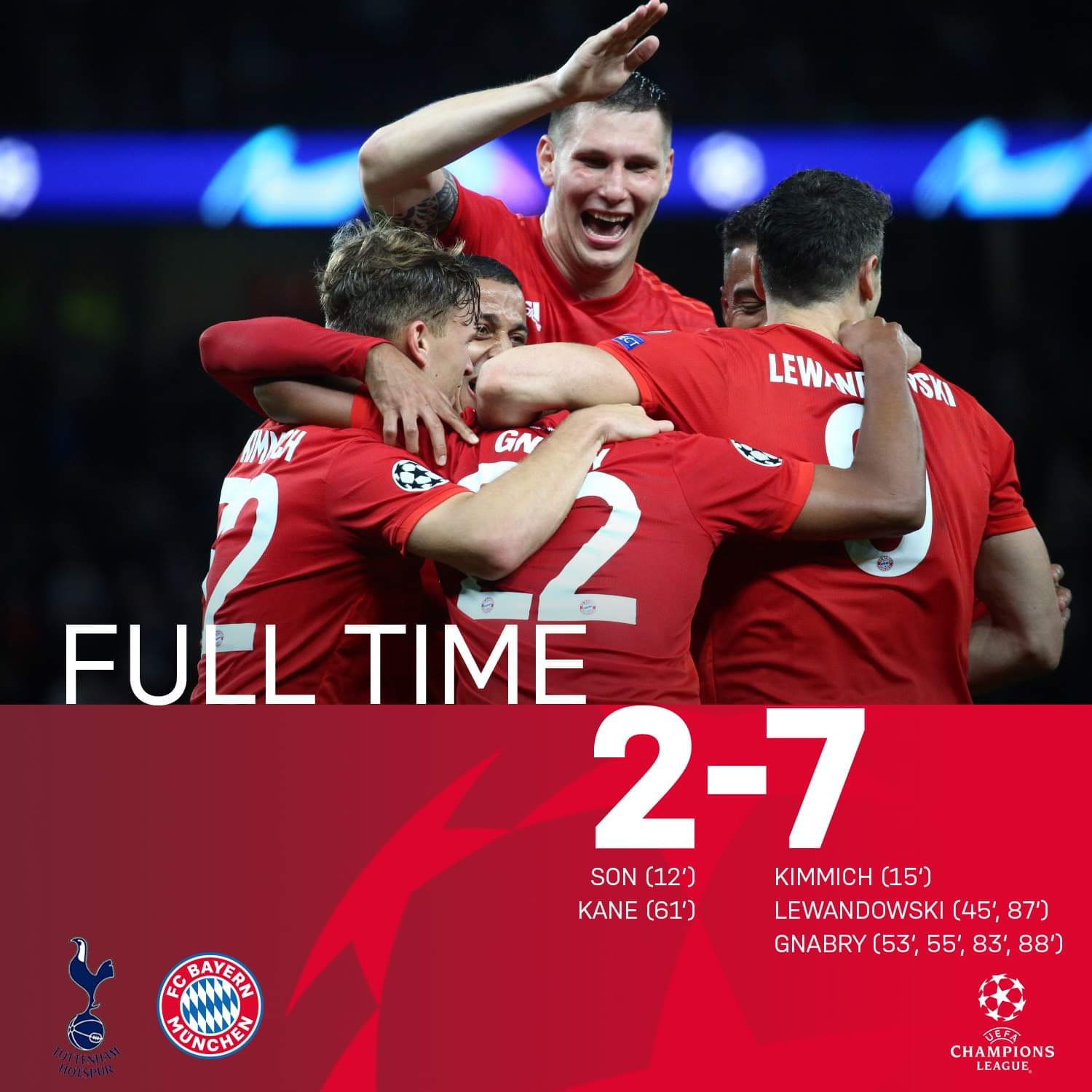 എന്നാൽ തുടങ്ങിവച്ച വെടിക്കെട്ട് നിർത്താൻ ബയേൺ ഒരുക്കമായിരുന്നില്ല. സ്പർസ്‌ പ്രതിരോധത്തെ കളിയാക്കും വിധം 85ആം മിനുട്ടിൽ ലെവൻഡോസ്‌കിയും 88ആം മിനുട്ടിൽ വീണ്ടും ഗണാബ്രിയും ഗോളുകൾ നേടി ജർമൻ ടീമിന്റെ പട്ടിക പൂർത്തിയാക്കി. സമീപകാലത്തെ ഏറ്റവും നാണംകെട്ട തോൽവി ഏറ്റുവാങ്ങിയ ടോട്ടൻഹത്തെ ഈ മത്സരം ഏറെക്കാലം വേട്ടയാടും. മറുവശത്തു ഈ വർഷം കിരീടപ്പോരാട്ടത്തിൽ മറ്റു ചാമ്പ്യൻസ് ലീഗ് ടീമുകൾക്ക് അതിശക്‌തമായ മുന്നറിയിപ്പാണ് ബയേൺ ഇന്ന് നൽകിയത്.