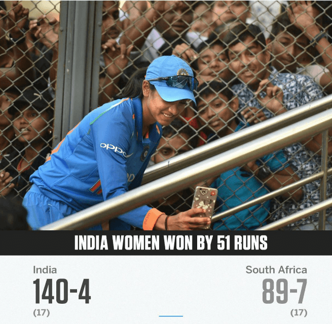 മഴ മൂലം 17 ഓവറാക്കി ചുരുക്കിയ മത്സരത്തിൽ ടോസ് നേടിയ ദക്ഷിണാഫ്രിക്ക ബൗളിങ് തിരഞ്ഞെടുക്കുകയായിരുന്നു. ആദ്യം ബാറ്റ് ചെയ്ത ഇന്ത്യ ഭേദപ്പെട്ട പ്രകടനമാണ് നടത്തിയത്. ഷഫാലി വർമയുടെയും(46), ജെമിനയുടെയും(33) ബാറ്റിംഗ് പ്രകടനത്തിൽ 140 റൺസ് നേടി.ദക്ഷിണാഫ്രിക്കയ്ക്ക് വേണ്ടി ക്ളർക് രണ്ട് വിക്കറ്റ് നേടി. മറുപടി ബാറ്റിങ്ങിനിറങ്ങിയ ദക്ഷിണാഫ്രിക്കയ്ക്ക് ബാറ്റിങ് വളരെ ദുഷ്കരമായിരുന്നു. റൺസ് എടുക്കാൻ അവർ വളരെ ബുദ്ധിമുട്ടി. 23 റൺസ് നേടിയ ലൗറ ആണ് അവരുടെ ടോപ് സ്‌കോറർ. ഇന്ത്യക്ക് വേണ്ടി പൂനം മൂന്നും, രാധ രണ്ടും വിക്കറ്റുകൾ നേടി. അഞ്ച് ടി20 മൽസരങ്ങൾ ഉള്ള പരമ്പരയിലെ അഞ്ചാം മത്സരം ഒക്ടോബർ നാലിന് നടക്കും.