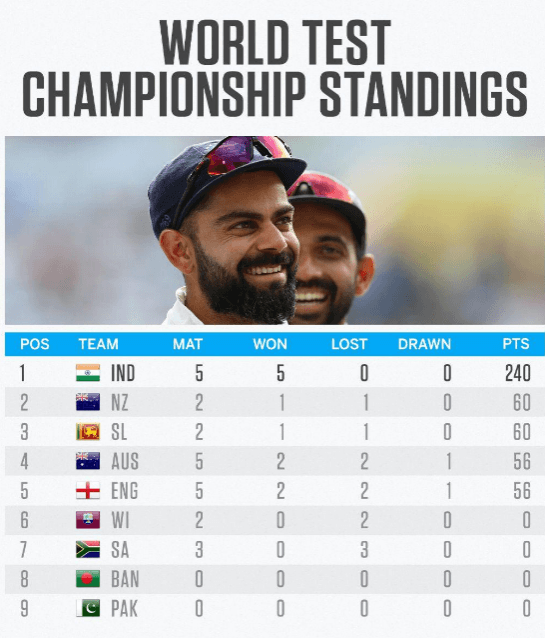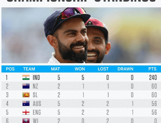 ആഷസ് മത്സരത്തോടെയാണ് ലോക ടെസ്റ്റ് ചാമ്ബ്യന്ഷിപ്പിന് തുടക്കമായത്. ന്യൂസിലൻഡിനെ ആദ്യ മൽസരത്തിൽ തോൽപ്പിച്ചതിലൂടെ ശ്രീലങ്ക ആയിരുന്നു ഒന്നാം സ്ഥാനത്ത്. എന്നാൽ പിന്നീട് ഇന്ത്യ വിൻഡീസ് പര്യടനം ജയിക്കുകയും, ആഷസ് ടെസ്റ്റ് സമനിലയിൽ പിരിഞ്ഞതോടെയും ഇന്ത്യ ഒന്നാമതെത്തി. ദക്ഷിണാഫ്രിക്കയെ മൂന്ന് ടെസ്റ്റിലും പരാജയപ്പെടുത്തിയതോടെയാണ് പോയിന്റ് 240 ആയത്. 60 പോയിന്റുമായി ന്യൂസിലൻഡും, ശ്രീലങ്കയുമാണ് രണ്ടും മൂന്നും സ്ഥാനത്തുള്ളത്. ആഷസ് മത്സരം സമനിലയിൽ എത്തിയതോടെ ഇംഗ്ലണ്ടിനും, ഓസ്ട്രേലിയക്കും 56 പോയിന്റ് ആണ് ഉള്ളത്. നാലും, അഞ്ചും സ്ഥാനത്താണ് ഇരുവരും ഒള്ളത്.ബാക്കിയുള്ള ടീമുകളുടെ പോയിൻറ് മുഴുവൻ കൂട്ടിയാലും ഇന്ത്യയുടെ പോയിന്റിന്റെ അത്രെയും എത്തില്ല. തുടർച്ചയായി അഞ്ചാം ടെസ്റ്റ് വിജയമാണ് ഇന്നലെ ദക്ഷിണാഫ്രിക്കയെ തോൽപ്പിച്ചതോടെ ഇന്ത്യ നേടിയത്.