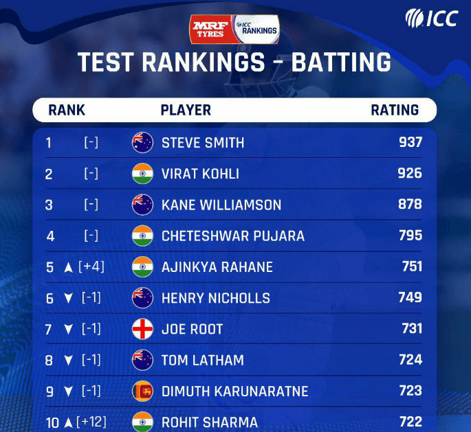 ടെസ്റ്റിൽ ഓപ്പണറായി അരങ്ങേറ്റം കുറിച്ച രോഹിത് രണ്ട് സെഞ്ചുറിയും, ഒരു ഡബിൾ സെഞ്ചുറിയും ആണ് നേടിയത്. ഈ ഡബിൾ സെഞ്ചുറിയുടെ ബലത്തിൽ ആണ് രോഹിത് ആദ്യ പത്തിൽ എത്തിയത്. 12 സ്ഥാനങ്ങളാണ് രോഹിത് പിന്നിലാക്കിയത്. ടെസ്റ്റിൽ ഇരുപത്തിരണ്ടാം സ്ഥാനത്തായിരുന്നു രോഹിത്. റാങ്കിങ്ങിൽ ഇപ്പഴും ഒന്നാം സ്ഥാനത്ത് ഓസ്ട്രേലിയൻ താരം സ്റ്റീവ് സ്മിത്ത് ആണ്. കൊഹ്ലി രണ്ടാം സ്ഥാനത്താണ് ഉള്ളത്. ആദ്യ അഞ്ച് സ്ഥാനങ്ങളിൽ മൂന്ന് ഇന്ത്യൻ താരങ്ങൾ ആണ് ഉള്ളത്. ചേതേശ്വര് പൂജാരയും, അജിന്ക്യ രഹാനെയും നാലും അഞ്ചും സ്ഥാനത്തുണ്ട്.