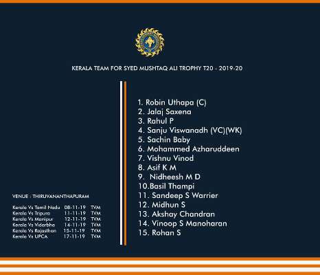 നവംബർ എട്ടിന് ആരംഭിക്കുന്ന സയ്യിദ് മുഷ്താഖ് അലി ട്രോഫി മത്സരത്തിനുള്ള കേരള ടീമിനെ പ്രഖ്യാപിച്ചു. 15 അംഗ ടീമിനെ ആണ് പ്രഖ്യാപിച്ചത്. റോബിൻ ഉത്തപ്പയാണ് ടീമിൻറെ നായകൻ. സഞ്ജു സാംസൺ ആണ് ടീമിൻറെ ഉപനായകൻ. കേരളത്തിൻറെ ആദ്യ മത്സരം നവംബർ എട്ടിന് തമിഴ്നാടിനെതിരെയാണ്.