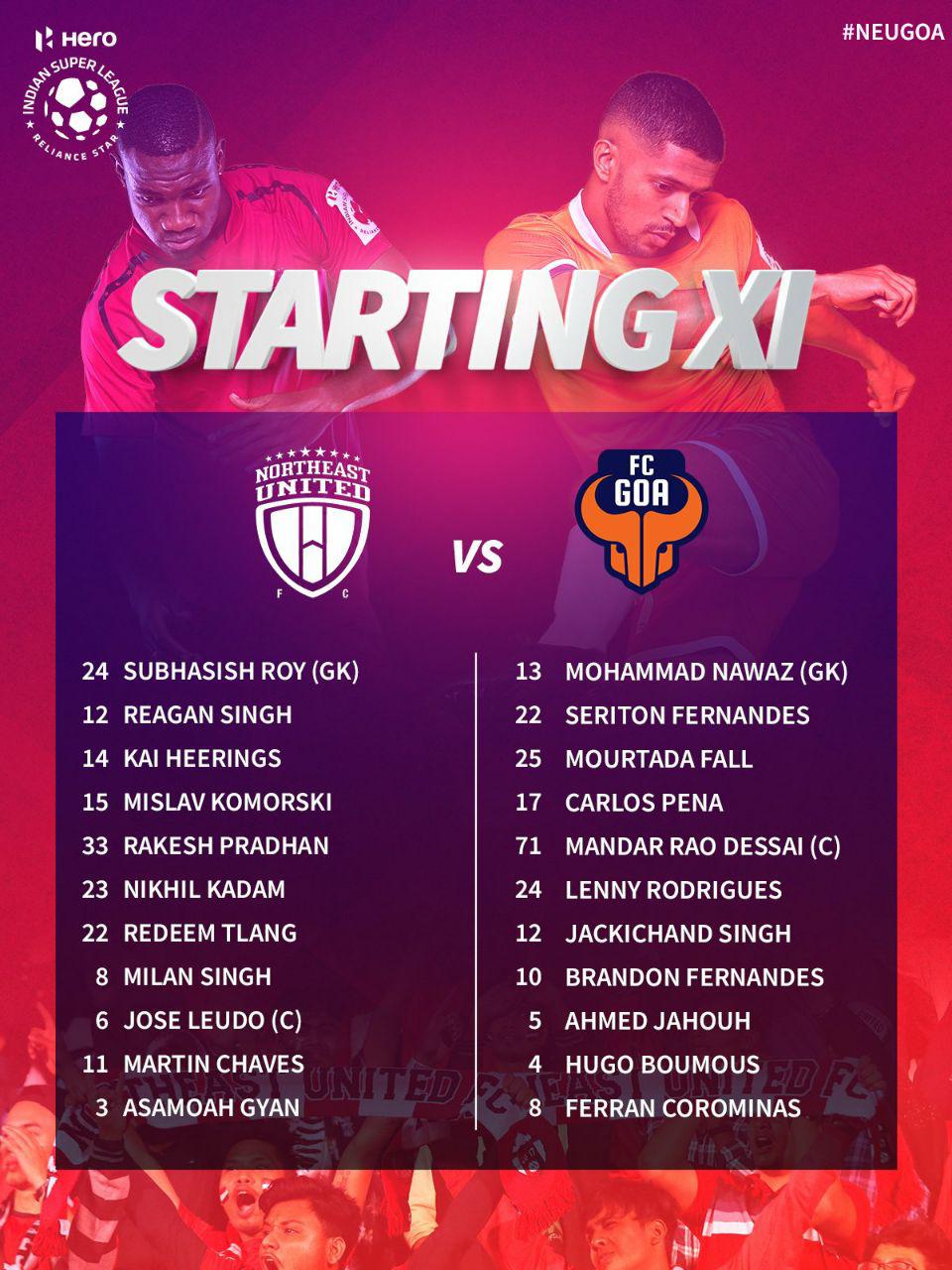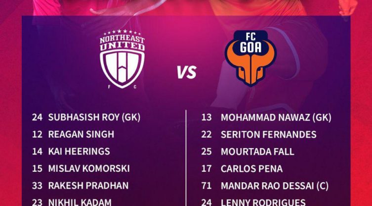 ഐ.എസ്.എല്:നോര്ത്ത് ഈസ്റ്റ്, ഗോവ ടീമുകളുടെ സ്റ്റാർട്ടിങ് ഇലവനെ പ്രഖ്യാപിച്ചു