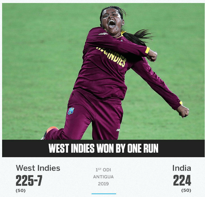 ടോസ് നേടിയ വിൻഡീസ് ബാറ്റിങ് തിരടഞ്ഞെടുക്കുകയായിരുന്നു. മികച്ച തുടക്കമാണ് വിൻഡീസിന് ലഭിച്ചത്. എന്നാൽ പിന്നീട് വിക്കറ്റുകൾ പെട്ടെന്ന് വീണത് അവരുടെ ബാറ്റിങ്ങിനെ ബാധിച്ചു. സ്റ്റെഫാനി ടെയ്ലർ(94), നതാഷ(51) എന്നിവരുടെ ബാറ്റിങ് മികവിലാണ് വിൻഡീസ് 225 റൺസ് നേടിയത്. ഇന്ത്യക്ക് വേണ്ടി ശിഖ പാണ്ഡേയും, ദീപ്തിയും രണ്ട് വിക്കറ്റ് വീതം നേടി. മറുപടി ബാറ്റിങ്ങിൽ പ്രിയയും(75), ജെമിമ റോഡ്രിഗസും(41) മികച്ച തുടക്കമാണ് ഇന്ത്യക്ക് നൽകിയത്. എന്നാൽ പിന്നീട് എത്തിയ താരങ്ങൾക്ക് അത് തുടർന്ന് കൊണ്ടുപോകാൻ കഴിഞ്ഞില്ല. ആദ്യ വിക്കറ്റിൽ ഇരുവരും ചേർന്ന് 78 റൺസ് ആണ് നേടിയത്. അനിസ മുഹമ്മദിൻറെ തകർപ്പൻ ബൗളിംഗ് ആണ് നടത്തിയത്. 46 റൺസ് വഴങ്ങി അഞ്ച് വിക്കറ്റ് ആണ് താരം നേടിയത്. മൂന്ന് ഏകദിനങ്ങൾ ഉള്ള പരമ്പരയിലെ രണ്ടാം ഏകദിനം നാളെ നടക്കും.