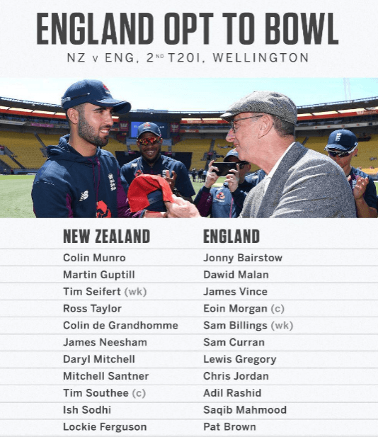 ഇംഗ്ലണ്ട് ടീം: ജോണി ബെയർസ്റ്റോ, ഡേവിഡ് മലൻ, ജെയിംസ് വിൻസ്, ഇയോൺ മോർഗൻ, സാം ബില്ലിംഗ്സ്, ലൂയിസ് ഗ്രിഗറി, സാം കുറാൻ, ക്രിസ് ജോർദാൻ, ആദിൽ റാഷിദ്, സാകിബ് മഹമൂദ്, 11 പാറ്റ് ബ്രൗൺ.