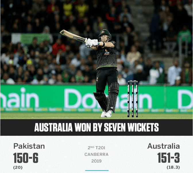 പാകിസ്ഥാൻറെ ഓസ്ട്രേലിയൻ പര്യടനത്തിലെ രണ്ടാം ടി20 മത്സരത്തിൽ ഓസ്ട്രേലിയക്ക് ഏഴ് വിക്കറ്റിന്റെ ജയം. ഇന്നലെ നടന്ന മത്സരത്തിൽ സ്റ്റീവ് സ്മിത്തിന്റെ തകർപ്പൻ ബാറ്റിങ്ങിലാണ് ഓസ്ട്രേലിയ വിജയം നേടിയത്. ആദ്യം ബാറ്റ് ചെയ്ത പാകിസ്ഥാൻ നിശ്ചിത 20 ഓവറിൽ 150 റൺസ് നേടി. മറുപടി ബാറ്റിങ്ങിനിറങ്ങിയ ഓസ്ട്രേലിയ 18.3 ഓവറില് മൂന്ന് വിക്കറ്റ് നഷ്ടത്തിൽ അനായാസ ജയം സ്വന്തമാക്കി. സ്റ്റീവ് സ്മിത്ത് പുറത്താകാതെ 81 റണ്സ് നേടി.