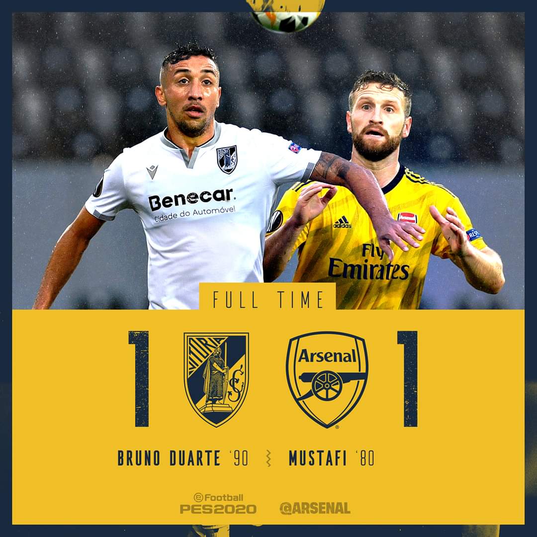 യൂറോപ്പ ലീഗിൽ ഗ്രൂപ്പ് സ്റ്റേജിലെ 4ആം മത്സരത്തിൽ ആർസെനലിനു സമനില. പോർച്ചുഗീസ് ടീമായ വിക്ടോറിയ ആണ് പീരങ്കിപ്പടയെ തളച്ചത്. സ്കോർ 1-1.ആർസെനലിനു വേണ്ടി സ്കോഡ്രൺ മുസ്താഫി ഗോൾ നേടിയപ്പോൾ വിക്ടോറിയയുടെ ഗോൾ അധികസമയത്ത് ദുവാർത്തെ നേടി.