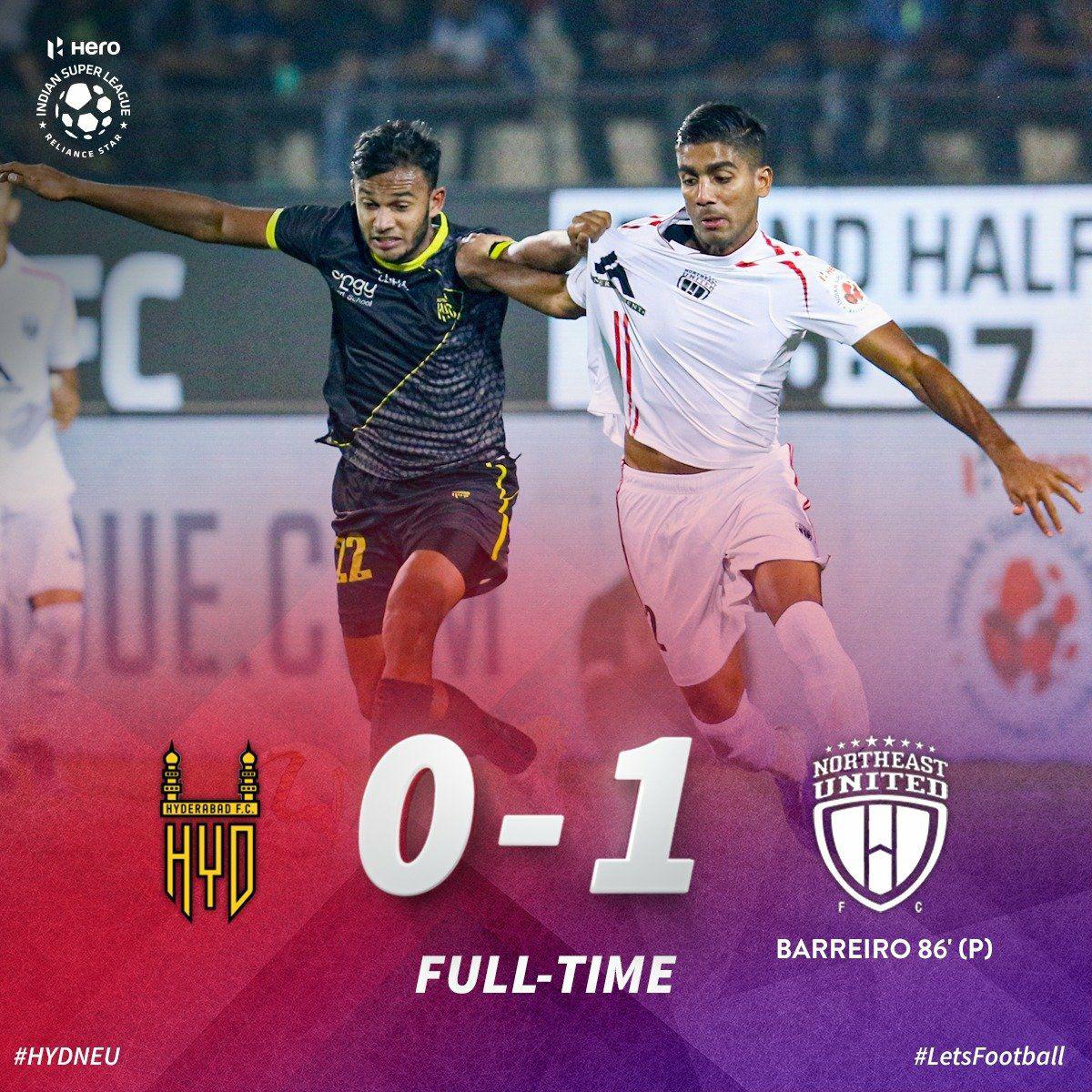 ഹൈദരാബാദിൻറെ ഹോം ഗ്രൗണ്ടിൽ നടന്ന മത്സരത്തിൽ മത്സരം അവസാനിക്കാൻ നിമിഷങ്ങൾ ബാക്കി നിൽക്കെ ആണ് നോർത്ത് ഈസ്റ്റ് വിജയം സ്വന്തമാക്കിയത്.മാകസി ബരെയ്റോയാണ് നോർത്ത് ഈസ്റ്റിന് വേണ്ടി ഗോൾ നേടിയത്. ഇരു ടീമുകളും നല്ല പ്രകടനമാണ് നടത്തിയത്. മത്സരത്തിൻറെ ആദ്യ പകുതിയിൽ ഹൈദരാബാദിനായിരുന്നു ആധിപത്യം. മികച്ച പാസുകളുമായി അവർ ഗ്രൗണ്ടിൽ നിറഞ്ഞു നിന്ന്. എന്നാൽ രണ്ടാം പകുതിയിൽ ആധിപത്യം നോർത്ത് ഈസ്റ്റ് ഏറ്റെടുത്തു. ഈ സീസണിൽ ഇതുവരെ ഒരു മത്സരവും തോൽക്കാത്ത ഏക ടീമായി നോർത്ത് ഈസ്റ്റ് മാറി. രണ്ട് ജയവും, രണ്ട് സമനിലയുമാണ് ഉള്ളത്.
