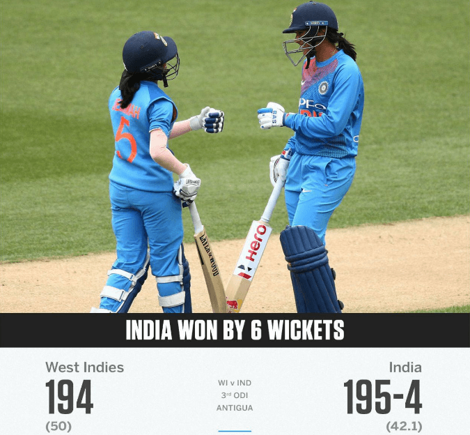 ഇന്ത്യയുടെ വിൻഡീസ് പര്യടനത്തിലെ മൂന്നാം ഏകദിന മത്സരത്തിൽ ഇന്ത്യക്ക് ആറ് വിക്കറ്റ് ജയം. ജയത്തോടെ ഇന്ത്യ ഏകദിന പരമ്പര സ്വന്തമാക്കി. വിൻഡീസ് ഉയർത്തിയ 194 റൺസ് പിന്തുടർന്ന ഇന്ത്യ 42.1 ഓവറിൽ നാല് വിക്കറ്റ് നഷ്ട്ടത്തിൽ വിജയം സ്വന്തമാക്കി. ഇന്ത്യൻ ഓപ്പണർമാരായ ജെമിയ റോഡ്രിഗസ്, സ്‌മൃതി മന്ദനായും ചേർന്ന് ഇന്ത്യൻ വിജയം അനായാസമാക്കി.