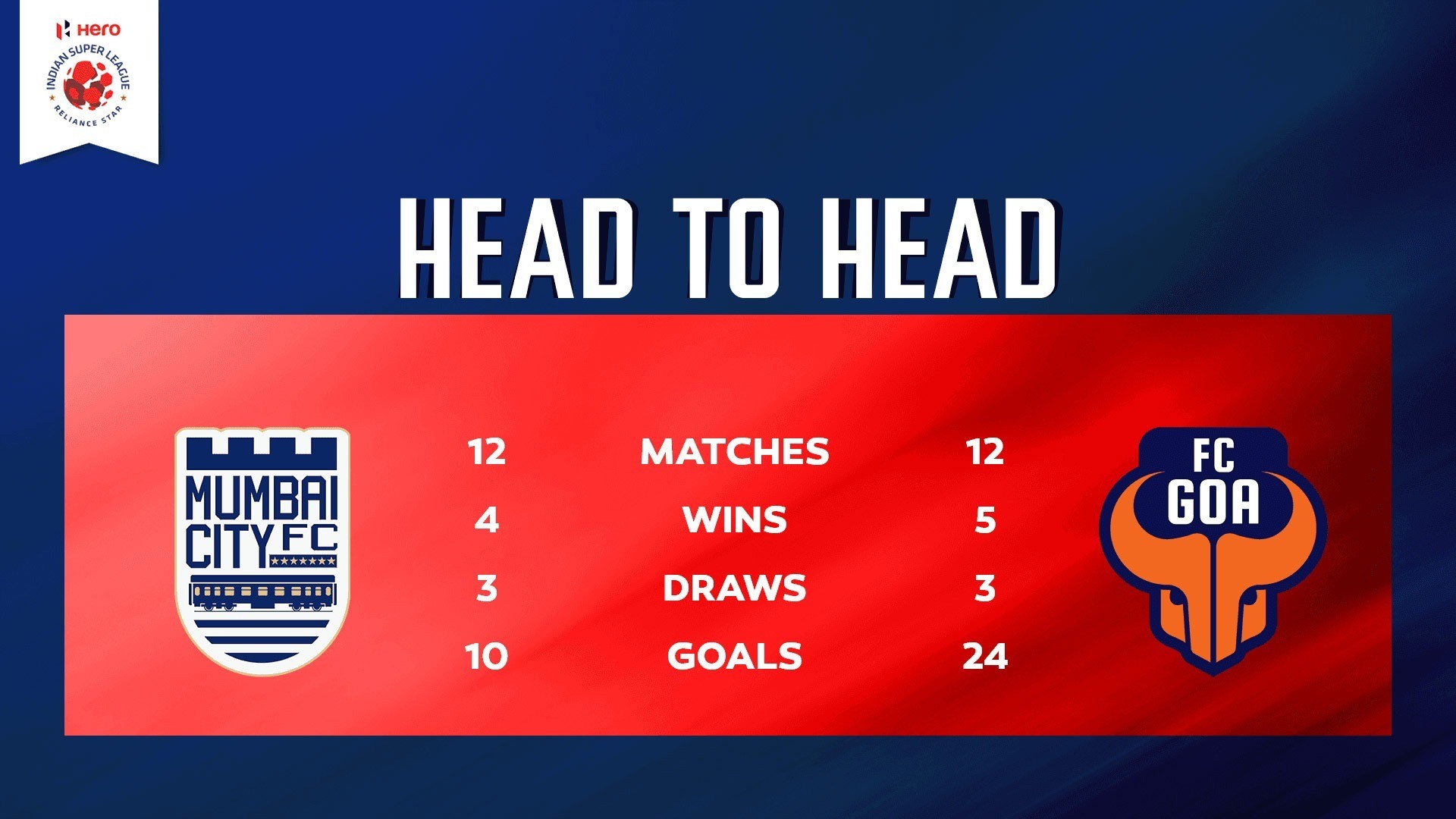 ഇരു ടീമുകളും ഇതിന് മുമ്പ് 12 തവണ ഏറ്റുമുട്ടിയപ്പോൾ ഗോവ അഞ്ച് തവണ ജയിച്ചപ്പോൾ മുംബൈയ്ക്ക് നാല് തവണ മാത്രമാണ് ജയിക്കാനായത്. പ്രതിക് ചൗധരി, സുഭാഷിഷ് ബോസ്, സർതക് ഗോലുയി,പോളോ മച്ചാഡോ, സെർജ് കെവിൻ, മുഹമ്മദ് ലാർബി എന്നിവർ ഇന്നത്തെ മത്സരത്തിൽ മുംബൈക്ക് വേണ്ടി കളിക്കുമെന്നാണ് റിപ്പോർട്ട്.