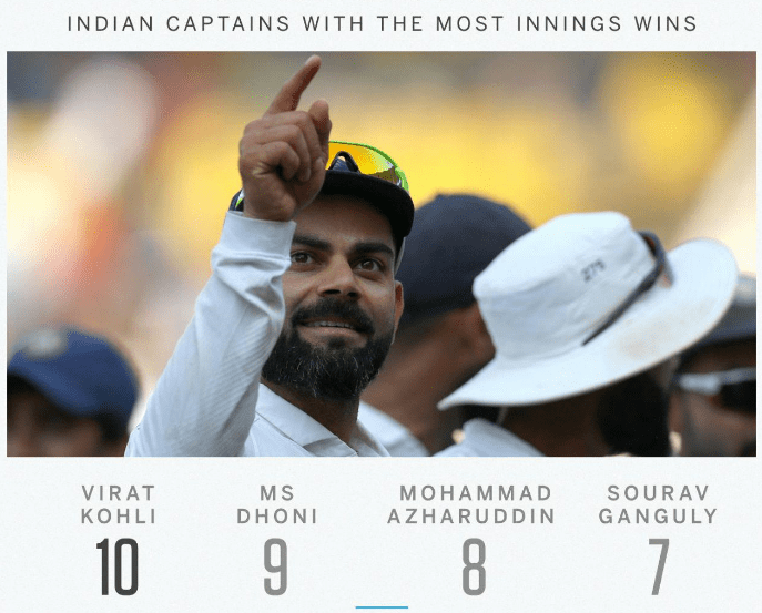 വിരാടിന്റെ നായകത്വത്തില് ഇന്ത്യ 10 ഇന്നിങ്സ് വിജയങ്ങളാണ് നേടിയത്. ധോണിയുടെ നായകത്വത്തില് ഇന്ത്യ 9 0 ഇന്നിങ്സ് വിജയങ്ങളാണ് നേടിയിരുന്നത്. ഈ റെക്കോഡ് ആണ് താരം ഇന്ന് മറികടന്നത്. ഗാംഗുലിയുടെയും, മുഹമ്മദ് അസ്ഹറുദ്ദീന്റെയും റെക്കോഡ് കോഹിലി ദക്ഷിണാഫ്രിക്കയ്ക്കെതിരെ നടന്ന മത്സരത്തിൽ വിജയിച്ചതോടെ മറികടന്നിരുന്നു. ബംഗ്ലാദേശിനെതിരെ തകർപ്പൻ ജയമാണ് ഇന്ത്യ നേടിയത്. തുടർച്ചയായ അരാം ടെസ്റ്റ് വിജയമാണ് ഇന്ത്യ ഇന്ന് നേടിയത്.