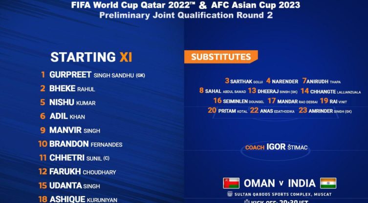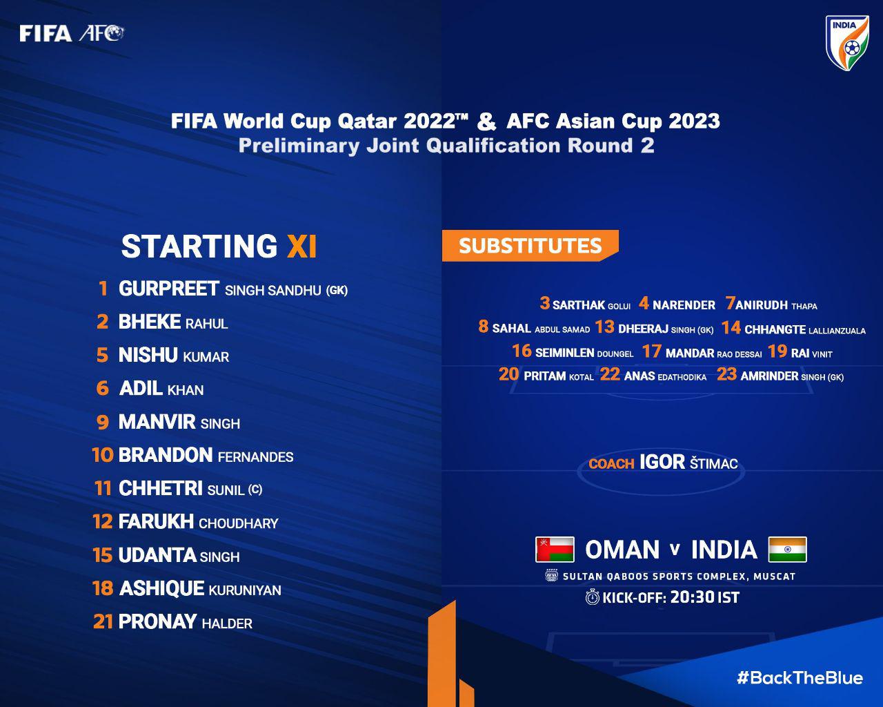ഫിഫ ലോകകപ്പ് യോഗ്യത: ഇന്ത്യയുടെ സ്റ്റാർട്ടിങ് ഇലവനെ പ്രഖ്യാപിച്ചു