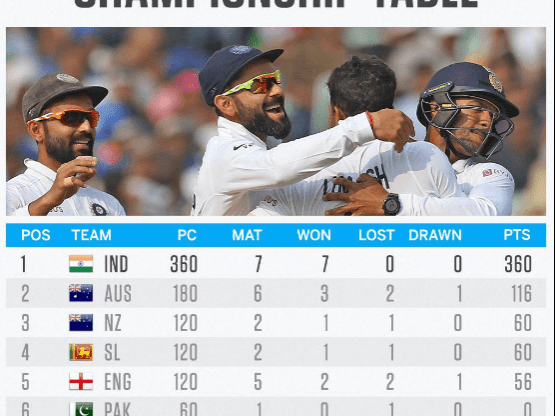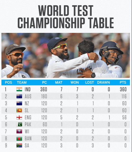 ലോക ടെസ്റ്റ് ചാമ്ബ്യന്‍ഷിപ്പിൽ ബംഗ്ലാദേശിനെതിരെയുള്ള രണ്ട് മൽസരങ്ങൾ കൂടി ജയിച്ചതോടെ 360 പോയിന്റുമായി ഇന്ത്യ അജയ്യരായി ഒന്നാം സ്ഥാനത്ത് തുടരുന്നു. കളിച്ച എല്ലാ ടെസ്റ്റ് മത്സരങ്ങള് ജയിച്ച ഇന്ത്യ മികച്ച നിലയിലാണ്. ഏഴ് കളികളിൽ ഏഴും ജയിച്ചാണ് ഇന്ത്യ 360 പോയിന്റ് നേടിയത്. വിൻഡീസിനെയും, ദക്ഷിണാഫ്രിക്കയേയുമാണ് ഇന്ത്യ തോൽപ്പിച്ചത്.
