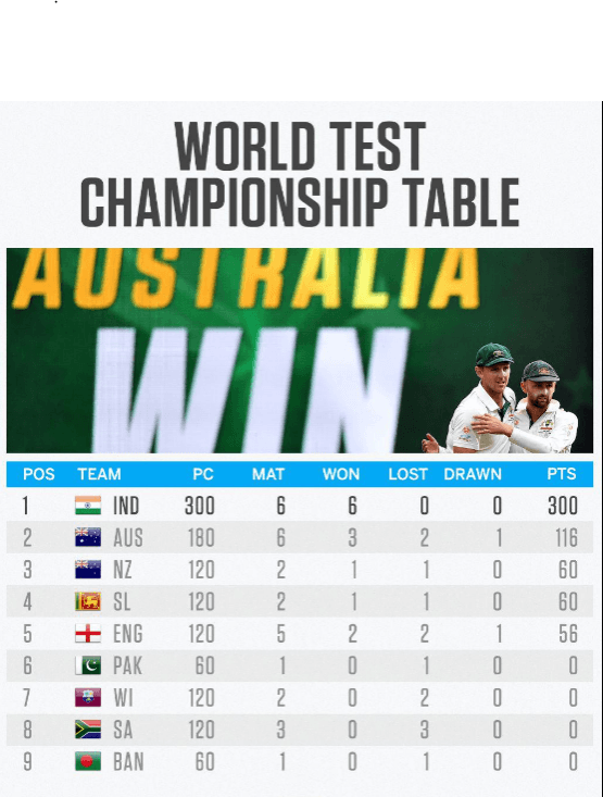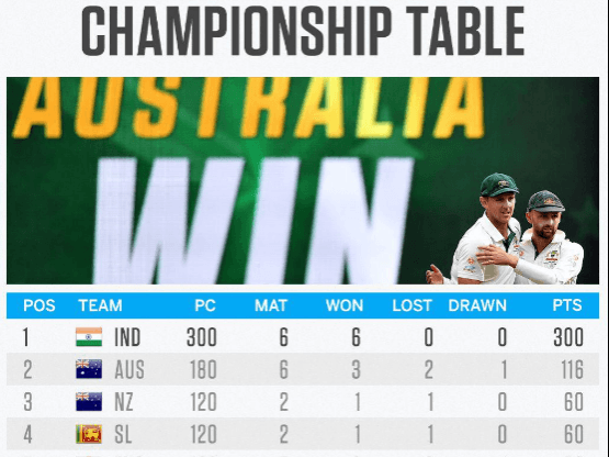ലോക ടെസ്റ്റ് ചാമ്ബ്യന്ഷിപ്പിൽപാകിസ്ഥാനെ ആദ്യ ടെസ്റ്റിൽ തോൽപ്പിച്ച് ഓസ്ട്രേലിയ പോയിന്റ് നിലയിൽ രണ്ടാമതെത്തി. ഇന്നിങ്ങ്സിനും, അഞ്ച് റൺസിനുമാണ് ഓസ്ട്രേലിയ പാകിസ്താനെ തോൽപ്പിച്ചത്. നാലാം സ്ഥാനത്തായിരുന്നു ഓസ്ട്രേലിയ ജയത്തോടെ നെസിലന്ഡിനെ പിന്നിലാക്കി രണ്ടാം സ്ഥാനത്തെത്തുകയായിരുന്നു. പാകിസ്ഥാനെതിരെ തകർപ്പൻ പ്രകടനമാണ് ഓസ്ട്രേലിയ നടത്തിയത്. ബാറ്റിങ്ങിലും, ബൗളിങ്ങിലും അവർക്ക് ഒരുപോലെ തിളങ്ങാൻ കഴിഞ്ഞു.