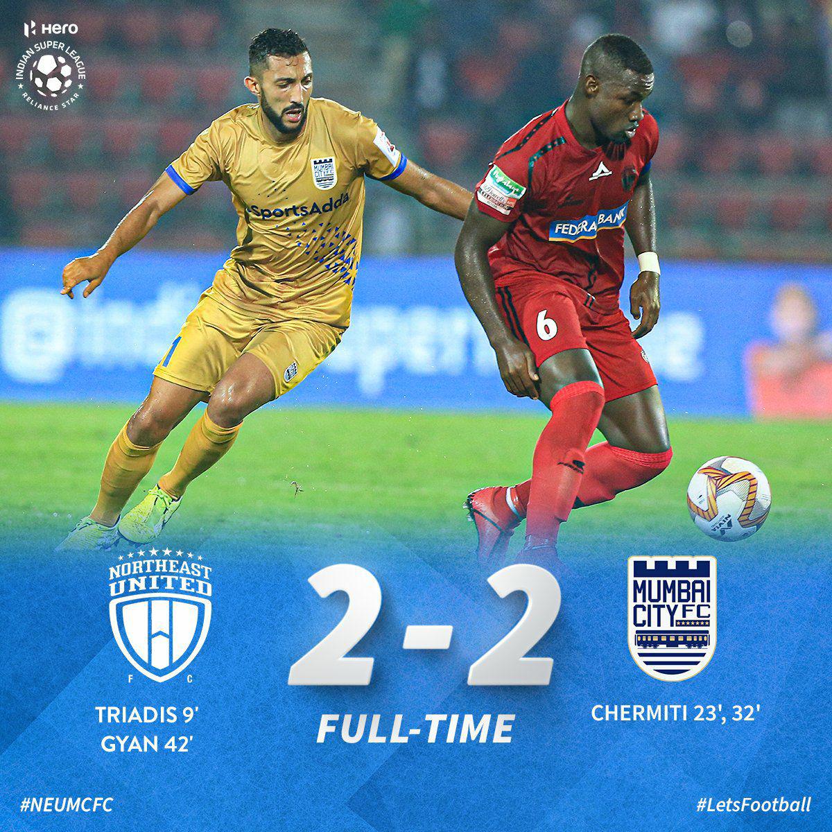 ഇന്ത്യൻ സൂപ്പർ ലീഗ് ഫുട്ബോളിന്റെ ആറാമത്തെ സീസണിലെ ഇരുപത്തിഅഞ്ചാം മത്സരത്തിൽ ഇന്നലെ നോര്ത്ത് ഈസ്റ്റ് യുണൈറ്റഡ് മുംബൈ സിറ്റി എഫ് സിയെ സമനിലയിൽ തളച്ചു. ഇരു ടീമുകളും രണ്ട് ഗോളുകൾ നേടിയ മത്സരം സമനിലയിൽ അവസാനിക്കുകയായിരിന്നു. ഈ സീസണിൽ പരാജയമറിയാത്ത നോർത്ത് ഈസ്റ്റ് 9 പോയിന്റുമായി നാലാം സ്ഥാനത്തെത്തി. അഞ്ച് കളികളിൽ രണ്ട് ജയവും, മൂന്ന് സമനിലയുമാണ് ഉള്ളത്. മുംബൈ അഞ്ച് പോയിന്റുമായി ഏഴാം സ്ഥാനത്തുമാണ് ഉള്ളത്.