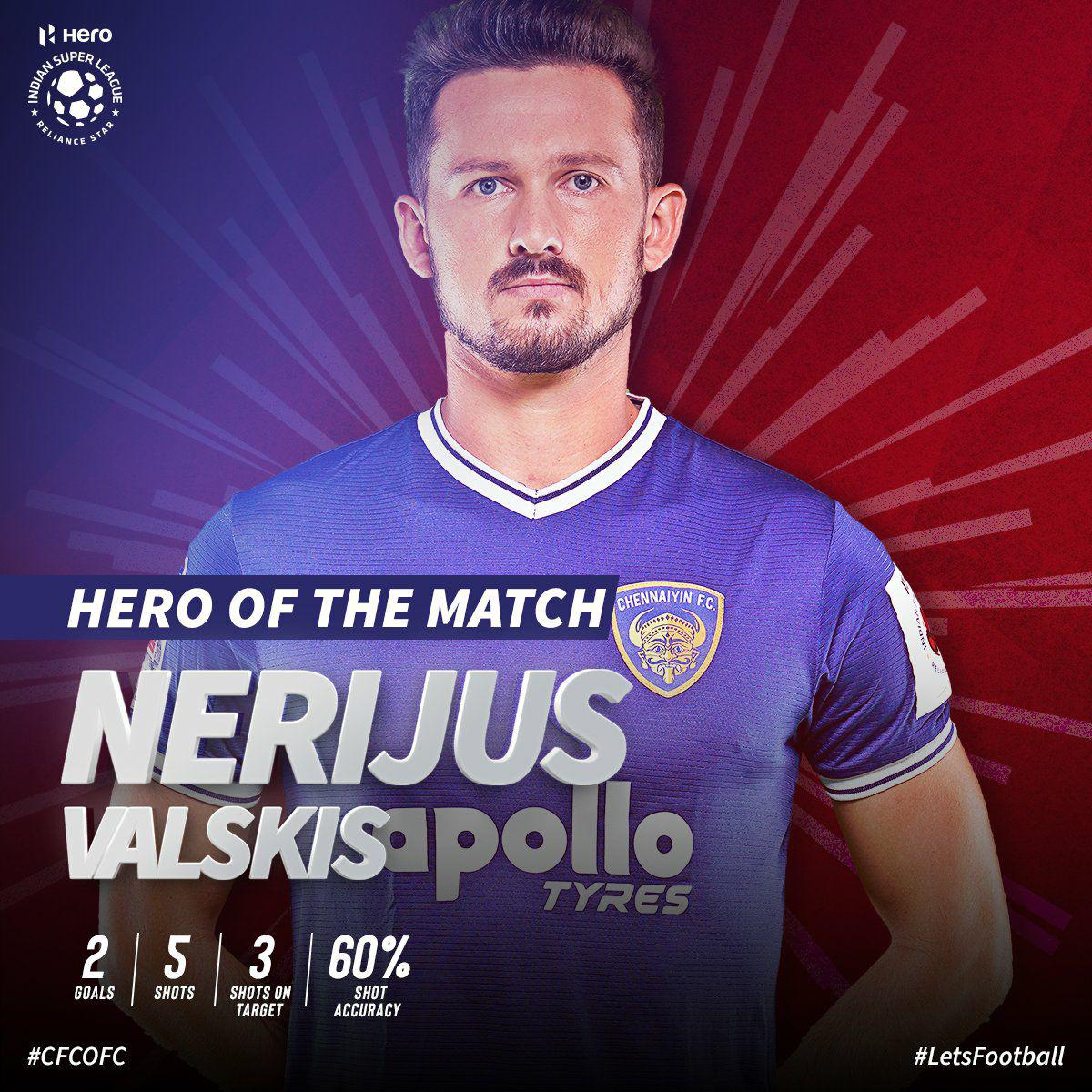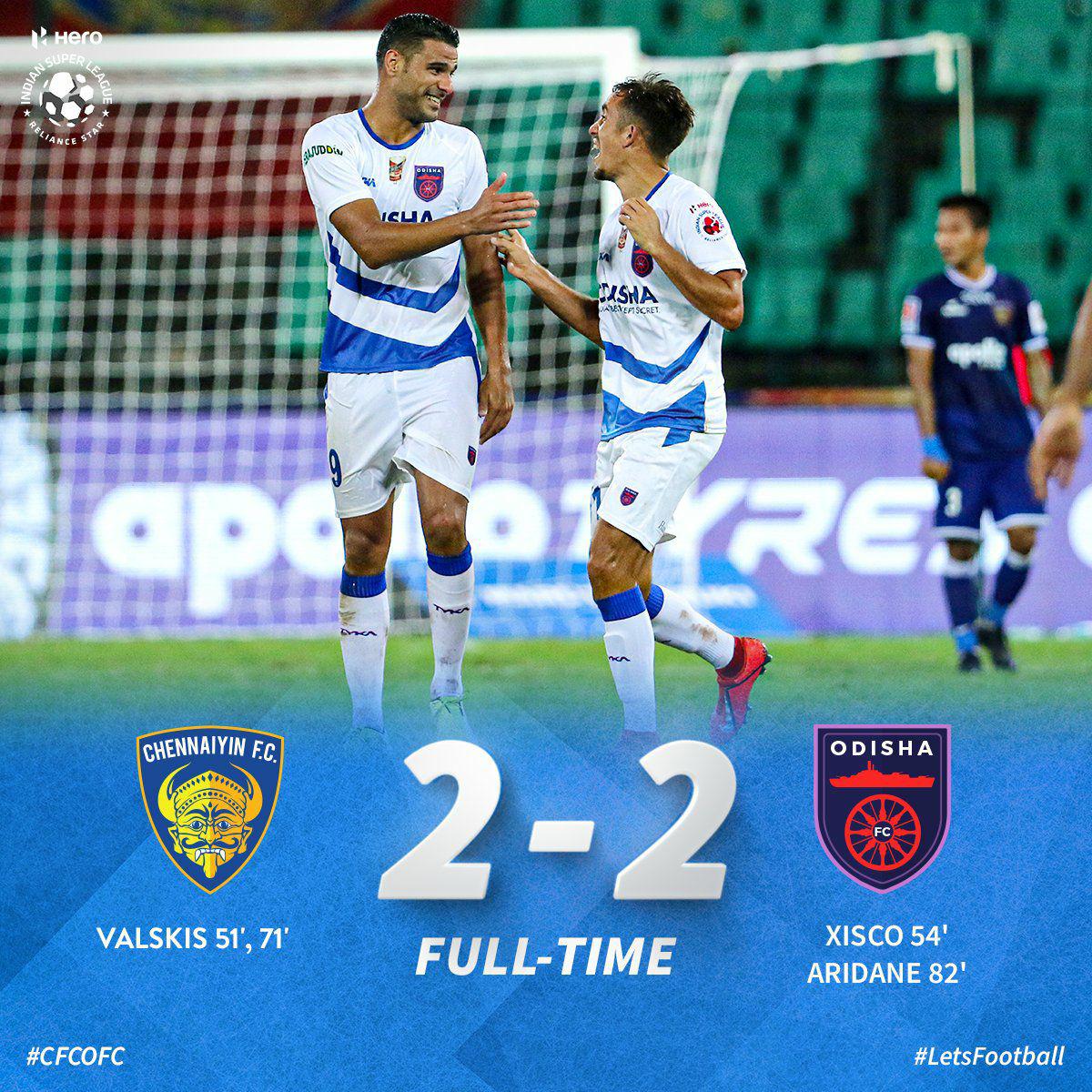 ഇന്ത്യൻ സൂപ്പർ ലീഗ് ഫുട്ബോളിൽ ഇന്നലെ നടന്ന ചെന്നൈയിൻ എഫ് സി, ഒഡീഷ എഫ് സി പോരാട്ടം സമനിലയിൽ അവസാനിച്ചു. ചെന്നൈയുടെ ഹോം ഗ്രൗണ്ടിൽ നടന്ന മത്സരത്തിൽ രണ്ട് ഗോൾ വീതം നേടി. രണ്ട് ടീമുകളും മികച്ച പ്രകടനമാണ് നടത്തിയതെങ്കിലും അൽപ്പം മുൻതൂക്കം ഒഡീഷയ്ക്കായിരുന്നു. ഗോൾ രഹിത ആദ്യ പകുതിക്ക് ശേഷം നാല് ഗോളുകളും പിറന്നത് രണ്ടാം പകുതിയിൽ ആയിരുന്നു. നെരിജസ് വാല്സ്കിസ് ആണ് ചെന്നൈയിൻ എഫ് സിക്ക് വേണ്ടി രണ്ട് ഗോളും നേടിയത്. സമനില നേടിയതോടെ അഞ്ച് പോയിന്റുമായി ചെന്നൈയിൻ എഫ് സി ഏട്ടൻ സ്ഥാനത്ത് എത്തി. ആറ് പോയിന്റ് ഉള്ള ഒഡീഷ ആറാം സ്ഥാനത്താണ് ഉള്ളത്.