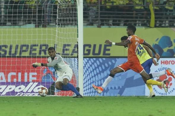 അവസാന നിമിഷങ്ങളിൽ സമനില ഗോൾ നേടാനുള്ള ഗോവയുടെ സമ്മർദ്ദതന്ത്രം കേരളത്തിന്റെ പ്രതിരോധനിരയുടെ താളം തെറ്റിച്ചു. ഇഞ്ചുറി ടൈമിൽ ബ്ലാസ്റ്റേഴ്സ് പ്രതിരോധം ശരിയായി ക്ലിയർ ചെയ്യാതിരുന്ന പന്തിൽ നിന്നും മൻവീർ സിംഗ് തൊടുത്ത തകർപ്പൻ ഷോട്ട് കേരള ഗോൾകീപ്പർ ടി. പി രഹനേഷ് തടുത്തെങ്കിലും റീബൗണ്ട് പിടിച്ചെടുത്ത ലെനി റോഡ്രിഗസ് ഗോളാക്കി മാറ്റുകയായിരുന്നു.
