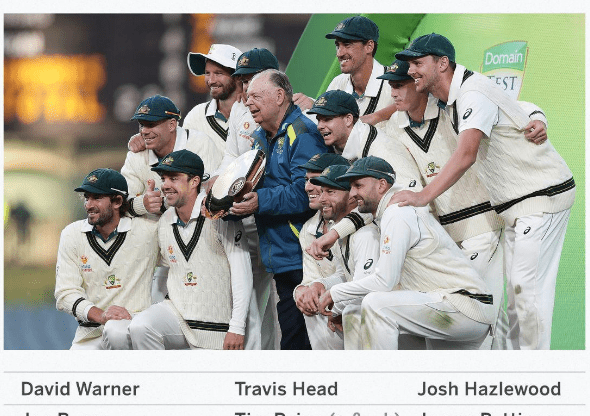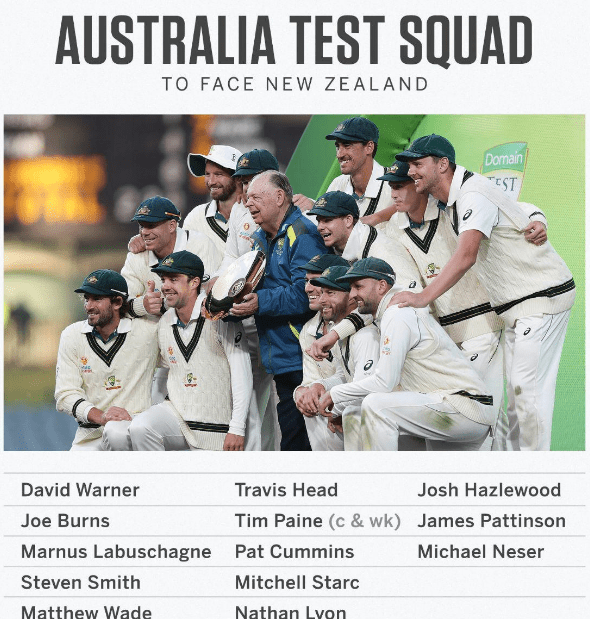 ഓസ്ട്രേലിയ ടെസ്റ്റ് സ്ക്വാഡ്: ടിം പെയ്ൻ, ജോ ബേൺസ്, പാറ്റ് കമ്മിൻസ്, ജോഷ് ഹാസ്ൽവുഡ്, ട്രാവിസ് ഹെഡ്, മർനസ് ലാബുഷാഗെൻ, നഥാൻ ലിയോൺ, മൈക്കൽ നെസർ, ജെയിംസ് പാറ്റിൻസൺ, സ്റ്റീവ് സ്മിത്ത്, മിച്ചൽ സ്റ്റാർക്ക്, മാത്യു വേഡ്, ഡേവിഡ് വാർണർ.