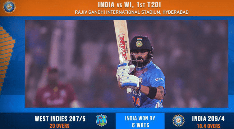 ഹൈദരാബാദ്: വെസ്റ്റ്ഇൻഡീസിൻറെ ഇന്ത്യൻ പര്യടനത്തിലെ ആദ്യ മത്സരത്തിൽ ഇന്ത്യക്ക് ആറ് വിക്കറ്റിൻറെ തകർപ്പൻ ജയം. കോഹ്ലിയുടെ തകർപ്പൻ ബാറ്റിങ്ങിൽ ആണ് ഇന്ത്യ വിജയം സ്വന്തമാക്കിയത്. വിൻഡീസ് ഉയർത്തിയ 208 റൺസ് പിന്തുടർന്ന ഇന്ത്യ 18.4 ഓവറിൽ വിജയം സ്വന്താമാക്കി. നായകനായി കൊഹ്ലി മുന്നിൽ നിന്ന് നയിച്ച മത്സരത്തിൽ കെ എൽ രാഹുലും മികച്ച ബാറ്റിങ്ങ് കാഴ്ചവെച്ചു. കൊഹ്ലി പുറത്താകാതെ 94 റൺസ് നേടി.