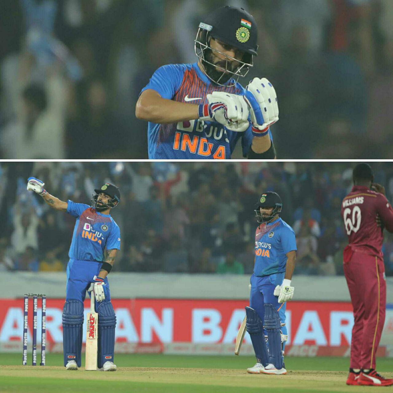 208 റൺസ് വിജയലക്ഷ്യവുമായി ഇറങ്ങിയ ഇന്ത്യക്ക് ഓപ്പണര് രോഹിത് ശര്മയെ പെട്ടെന്ന് നഷ്ടമായി. പിന്നീട് എത്തിയ കോഹ്ലിയും, രാഹുലും ചേർന്ന് മികച്ച ബാറ്റിങ്ങ് ആണ് നടത്തിയത്. രണ്ടാം വിക്കറ്റിൽ ഇരുവരും ചേർന്ന് 100 റൺസ് നേടി. രാഹുൽ പുറത്തായതിന് ശേഷം കൊഹ്ലി ഒറ്റയ്ക്കാണ് ഇന്ത്യയെ വിജയത്തിലെത്തിച്ചത്. 50 പന്തില് വിരാട് കോലി നേടിയ 94 റണ്സാണ് ഇന്ത്യയെ വിജയത്തിൽ എത്തിച്ചത്. കെ എൽ രാഹുൽ 40 പന്തില് 62 റണ്സ് നേടി. വിൻഡീസിന് വേണ്ടി ഖാരി പിയറി രണ്ട് വിക്കറ്റ് നേടി.