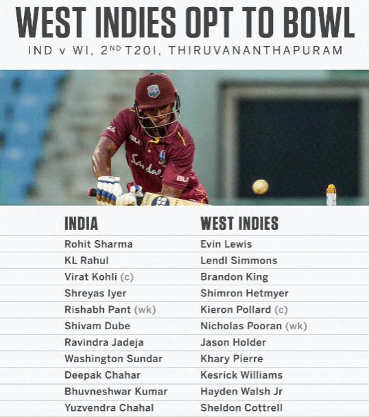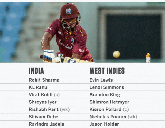 വെസ്റ്റ് ഇൻഡീസ് ഇലവൻ: എൽ സിമ്മൺസ്, ഇ ലൂയിസ്, ബി കിംഗ്, എസ് ഹെറ്റ്മിയർ, എൻ പൂരൻ, കെ പൊള്ളാർഡ്, ജെ ഹോൾഡർ, കെ പിയറി, കെ വില്യംസ്, എസ് കോട്രെൽ, എച്ച് വാൽഷ്.