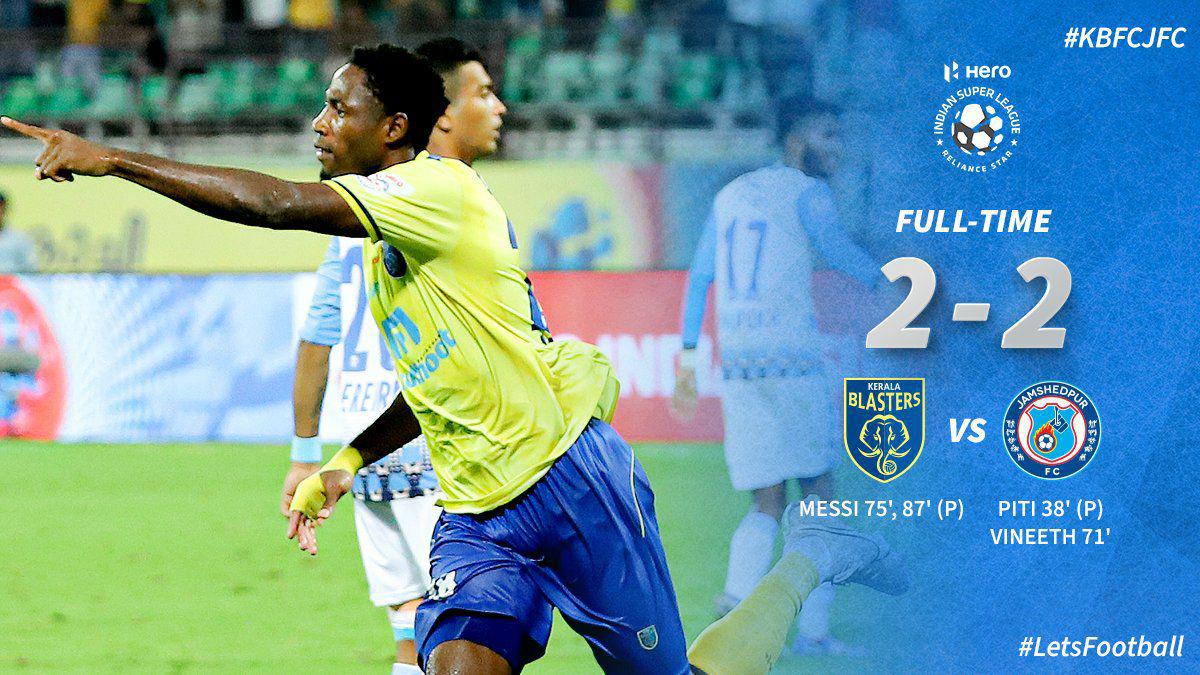 കൊച്ചി: ഇന്ത്യന് സൂപ്പര് ലീഗില് ഇന്നലെ നടന്ന ജംഷഡ്പൂർ എഫ്സി കേരള ബ്ലാസ്റ്റേഴ്സ് മൽസരം സമനിലയിൽ അവാനിച്ചു. തോറ്റെന്നുറപ്പിച്ച മത്സരത്തിൽ ബ്ലാസ്റ്റേഴ്സ് താരം മെസ്സി നേടിയ രണ്ട് ഗോളിൽ അവർ ജംഷഡ്പൂർ എഫ്സിയെ സമനിലയിൽ തളച്ചു. കേരളാബ്ലാസ്റ്റേഴ്സ് ടീമിന് വേണ്ടി കൊച്ചിയിലെ ഹോം ഗ്രൗണ്ടിൽ ഏറ്റവും കൂടുതൽ ഗോളുകൾ നേടിയ, നിലവിലെ ജംഷഡ്പൂർ താരമായ സികെ വിനീത് ആദ്യമായി കേരളത്തിനെതിരെ അതെ ഗ്രൗണ്ടിൽ ഗോൾ നേടി. രണ്ടാം പകുതിയിൽ ഉണർന്ന് കളിച്ച കേരളം മികച്ച പ്രകടനമാണ് നടത്തിയത്. രണ്ട് ഗോളിന് പിന്നിൽ നിന്നതിന് ശേഷമാണ് ബ്ലാസ്റ്റേഴ്സ് സമനില നേടിയത്. പരിക്കിന്റെ പിടിയിലമർന്നിരുന്ന മുഹമ്മദ് രാകിപ് പൂർണ ക്ഷമത നേടി തിരിച്ചു ടീമിലെത്തിയിരുന്നു.