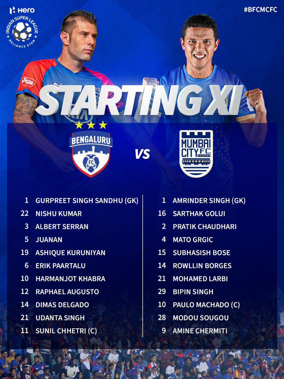 ഐഎസ്എൽ: ബംഗളൂരു എഫ്സി മുംബൈ എഫ് സി ടീമുകളുടെ സ്റ്റാർട്ടിങ് ഇലവനെ പ്രഖ്യാപിച്ചു