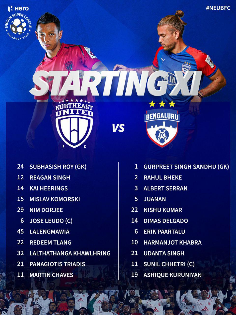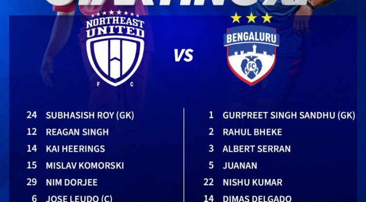 ഐഎസ്എൽ: നോര്ത്ത് ഈസ്റ്റ് യുണൈഡ് ബെംഗളൂരു എഫ് സി ടീമുകളുടെ സ്റ്റാർട്ടിങ് ഇലവനെ പ്രഖ്യാപിച്ചു