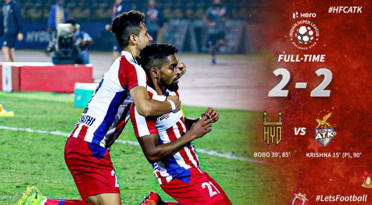 ഇന്ത്യൻ സൂപ്പർ ലീഗ് ഫുട്‌ബോളിന്റെ ആറാം സീസണിൽ ഇന്നലെ നടന്ന ഹൈദരാബാദ്  എടികെ മൽസരം സമനിലയിൽ അവസാനിച്ചു. ഇരു ടീമുകളും രണ്ട് ഗോളുകൾ ആണ് നേടിയത്, അവസാന നിമിഷം എടികെ നേടിയ ഗോളിലാണ് സമനില നേടിയത്.  റോയി കൃഷ്ണയാണ് എ ടികെയ്ക്ക് വേണ്ടി രണ്ട് ഗോളും നേടിയത്, അതേപോലെ ഹൈദരാബാദിന് വേണ്ടിയും രണ്ട് ഗോളുകളും നേടിയത് ബോബോ ആണ്. അനായാസം ജയിക്കാം എന്ന് കരുതിയ  എടികെയെ ഹൈദരാബാദ് സമനിലയിൽ തളക്കുകായയിരുന്നു. സമനില ആയതിലൂടെ  എടികെയ്ക്ക് ഒന്നാം സ്ഥാനം നേടാൻ കഴിഞ്ഞില്ല . 9 കളികളിൽ നിന്ന് 15 പോയിന്റുമായി അവർ രണ്ടാം സ്ഥാനത്താണ്, ഹൈദരാബാദിന് അഞ്ച് പോയിന്റ് ആണ് ഉള്ളത്.