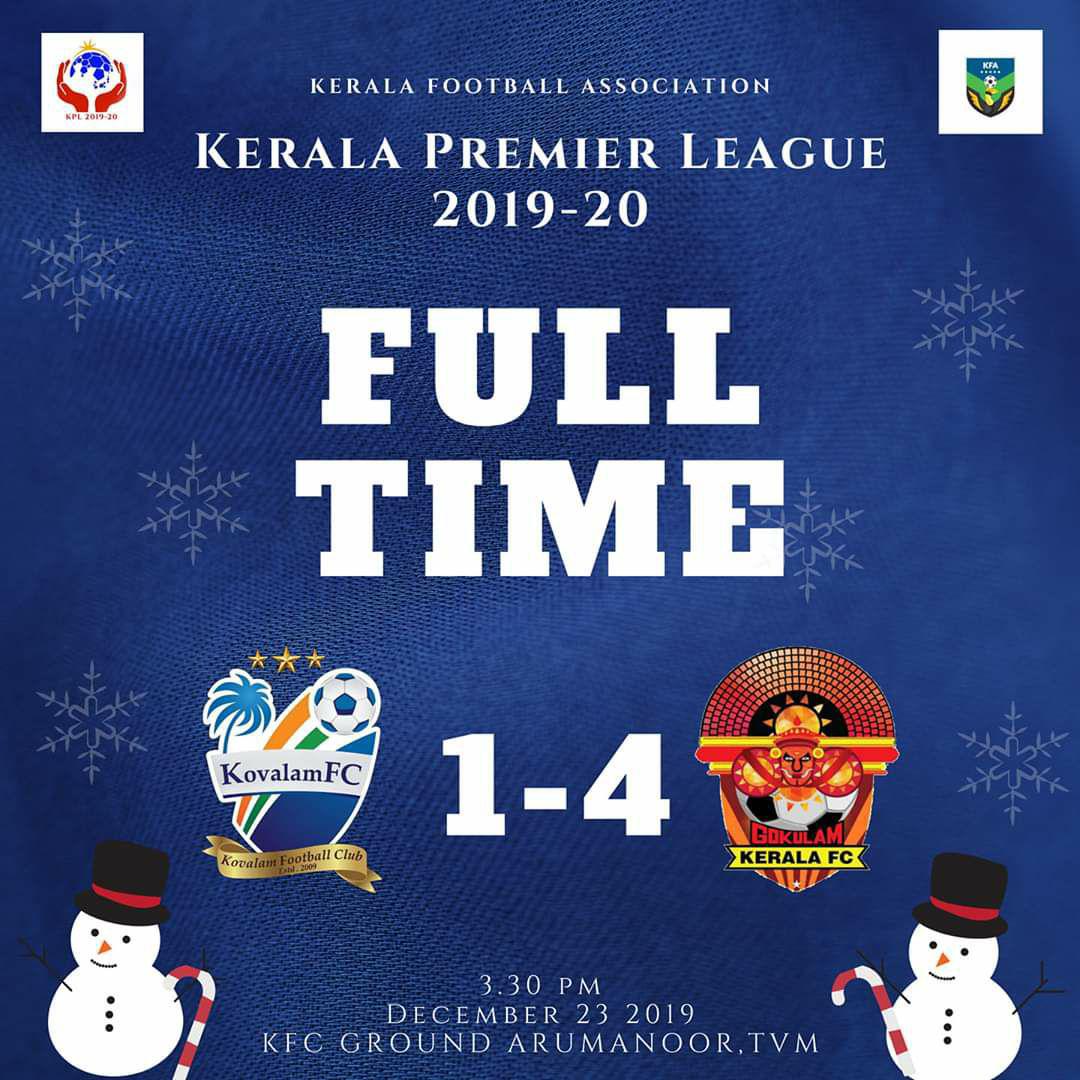 കേരള പ്രീമിയര് ലീഗില് ഇന്നലെ നടന്ന മൽസരത്തിൽ ഗോകുലത്തിന് ജയം. കോവളം എഫ് സിയെ ആണ് ഗോകുലം തോൽപ്പിച്ചത്.ഒന്നിനെതിരെ നാല് ഗോളുകൾക്കാണ് ഗോകുലം ജയിച്ചത്. ജയത്തോടെ ഗോകുലം പോയിന്റ് നിലയിൽ ഒന്നാമതെത്തി. വിഷ്ണു, ശിഹാദ് എന്നിവരാണ് ഗോകുലത്തിന് വേണ്ടി ഗോളുകൾ നേടിയത്. ഷിഹാദ് ഹാട്രിക് ഗോൾ നേടി.