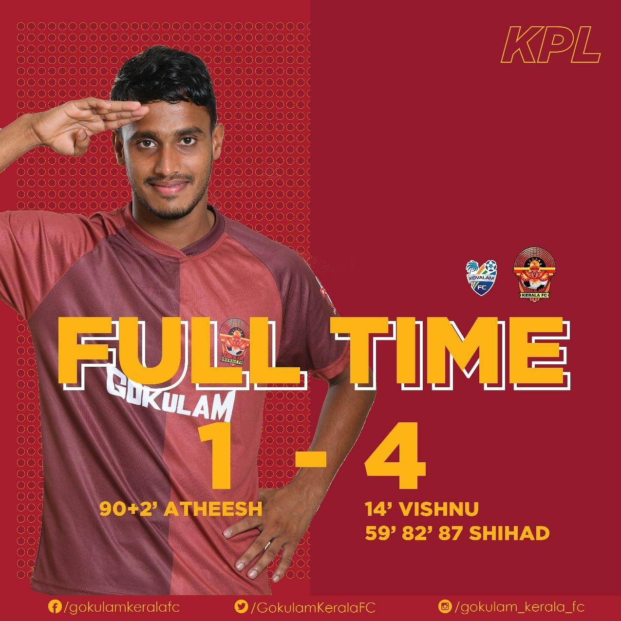 ആദ്യ പകുതിയിൽ ഒരു ഗോൾ നേടി ഗോകുലം മുന്നിലെത്തി. വിഷ്ണു ആണ് ആദ്യ ഗോൾ നേടിയത് . പിന്നീട് രണ്ടാം പകുതിയിൽ ആണ് ഷിഹാദ് മൂന്ന് ഗോളുകൾ നേടിയത്. 59, 82, 87 എന്നീ മിനിറ്റുകളിലാണ് ഗോളുകൾ പിറന്നത്. ആദ്യ മത്സരത്തിൽ ഗോകുലം ബ്ലാസ്റ്റേഴ്സിനെ തോൽപ്പിച്ചിരുന്നു.