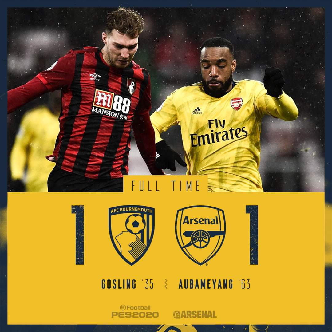 ഇംഗ്ലീഷ് പ്രീമിയർ ലീഗിൽ പുതിയ മാനേജർ മിക്കേൽ ആർട്ടെറ്റയുടെ കീഴിൽ 19ആം റൗണ്ട് മത്സരത്തിനിറങ്ങിയ ആർസെനലിനു സമനില.എവേ മത്സരത്തിൽ ബോൺമൗത്തിനോടാണ് ആർസെനൽ സമനില വഴങ്ങിയത്. സ്കോർ 1-1. ബോൺമൗത്തിനു വേണ്ടി ഗോസ്‌ലിംഗും ആര്സെനലിന്റെ ഗോൾ അബാമേയങ്ങും നേടി.