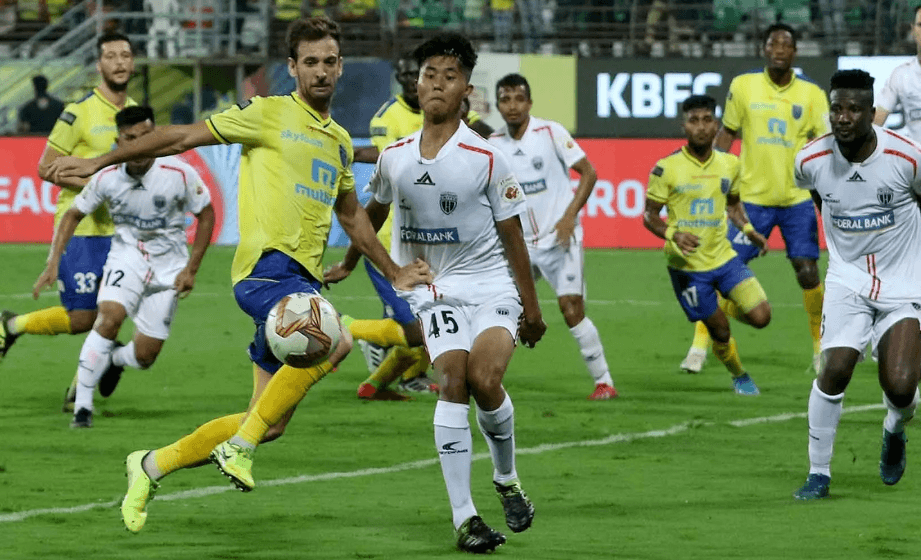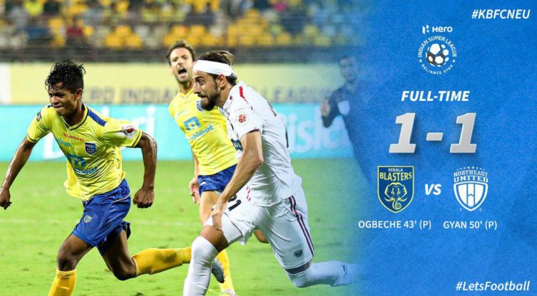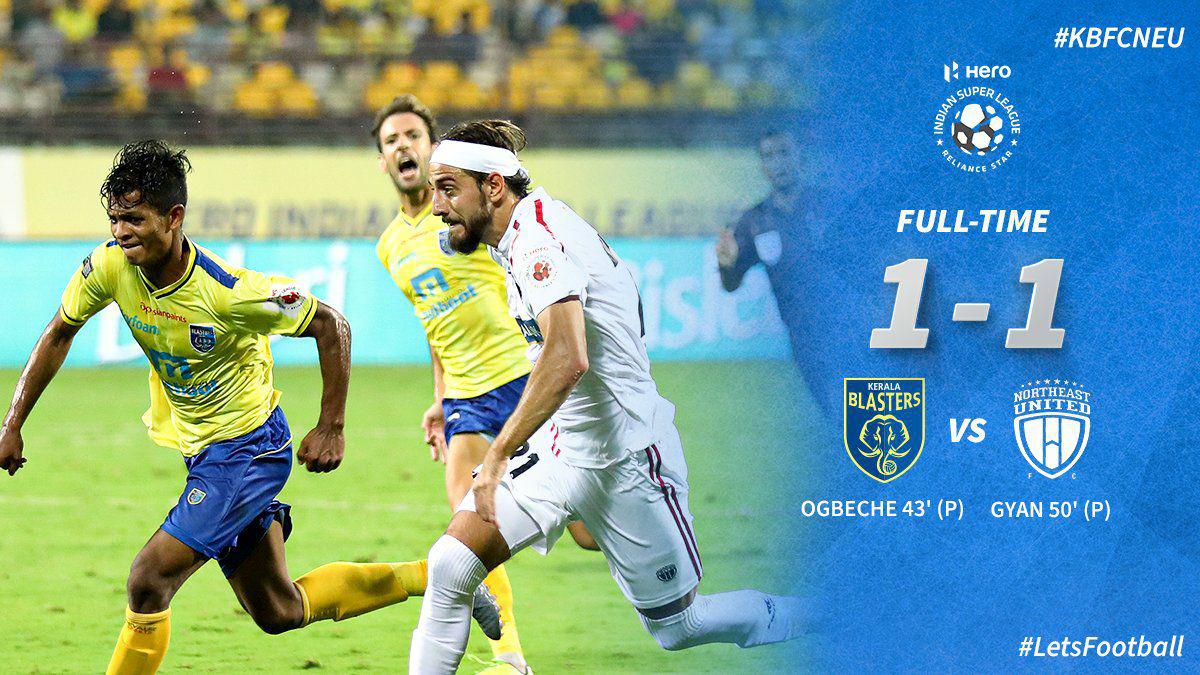 ഇന്ത്യൻ സൂപ്പർ ലീഗ് ഫുട്ബോളിന്റെ ആറാം സീസണിൽ ഇന്നലെ നടന്ന കേരളാബ്ലാസ്റ്റേഴ്സ് എഫ്സി നോർത്ത്ഈസ്റ്റ് യുണൈറ്റഡ് എഫ്സി മൽസരം സമനിലയിൽ അവസാനിച്ചു. ഇരു ടീമുകളും ഓരോ ഗോൾ വീതം നേടി. രണ്ട് ടീമും പെനാൽറ്റിയിലൂടെയാണ് ഗോൾ നേടിയത്. രണ്ട് ടീമുകൾക്കും നിരവധി അവസരങ്ങൾ ആണ് ലഭിച്ചത്. എന്നാൽ ഒന്നും ലക്ഷ്യ സ്ഥാനത്ത് എത്തിയില്ല. ഒഗ്ബെച്ചേ ആണ് കേരളത്തിന് വേണ്ടി ഗോൾ നേടിയപ്പോൾ നോർത്ത് ഈസ്റ്റിന് വേണ്ടി ഗ്യാന് ആണ് ഗോൾ നേടിയത്.
