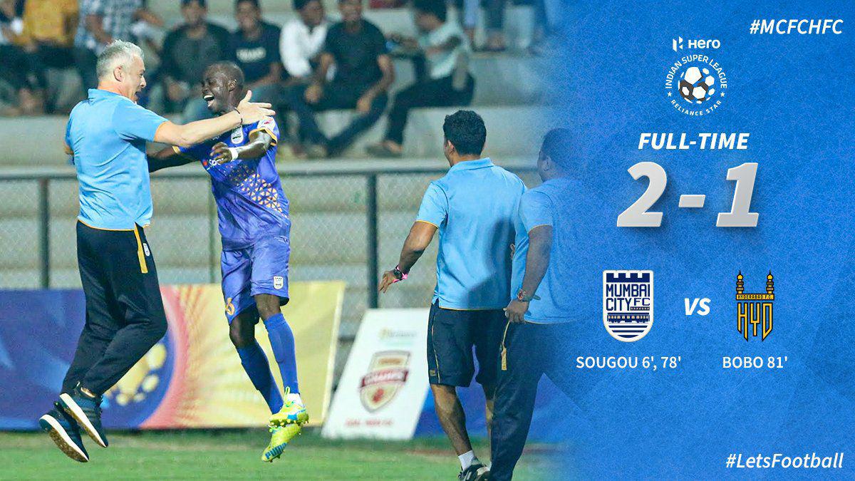 ന്ത്യൻ സൂപ്പർ ലീഗ് ഫുട്ബോളിന്റെ ആറാം സീസണിൽ ഇന്ന് നടന്ന മത്സരത്തിലും ഹൈദരാബാദ് എഫ് സിക്ക് തോൽവി. ഇന്നലെ നടന്ന മത്സരത്തിലെ മുംബൈ സിറ്റിയോടാണ് അവർ തോറ്റത്. ഒന്നിനെതിരെ രണ്ട് ഗോളുകൾക്കാണ് മുംബൈ വിജയിച്ചത്. ജയത്തോടെ മുംബൈ നാലാം സ്ഥാനത്ത് എത്തി. മുംബൈക്ക് വേണ്ടി മോഡു സൗഗു ആണ് രണ്ട് ഗോളും നേടിയത്. ഹൈദരാബാദ് എഫ് സിക്ക് വേണ്ടി ബോബോയാണ് ഗോൾ നേടിയത്.