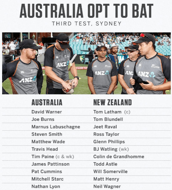 മൂന്ന് ടെസ്റ്റ് മത്സരങ്ങൾ ഉള്ള പരമ്പരയിൽ ആദ്യ രണ്ട് മത്സരങ്ങളും ജയിച്ച ഓസ്ട്രേലിയ പരമ്പര സ്വന്തമാക്കി. രണ്ട് ടെസ്റ്റിലും മികച്ച പ്രകടനമാണ് ഓസ്ട്രേലിയ നടത്തിയത് . രണ്ട് ടെസ്റ്റിലും ജയിച്ച ഓസ്ട്രേലിയ മൂന്നാം ടെസ്റ്റും ജയിച്ച് പരമ്പര തൂത്തുവാരാൻ ആകും ഇന്ന് ഇറങ്ങുക. ന്യൂസിലൻഡ് നായകൻ കെയിൻ വില്യംസൺ മൂന്നാം ടെസ്റ്റിൽ കളിക്കുന്നില്ല. ലാതം ആണ് നായകൻ. ട്രെന്റ് ബോൾട്ടും ഇന്ന് കളിക്കുന്നില്ല.ഗ്ളെൻ ഫിലിപ്സ് ടീമിൽ ഇടം നേടി, അദ്ദേഹത്തിൻറെ ആദ്യ ടെസ്റ്റ് മത്സരമാണിത്.