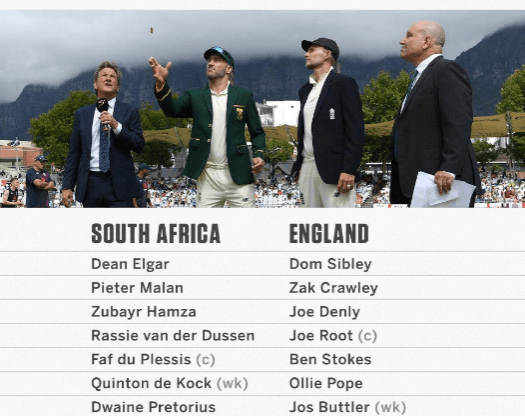 ഇംഗ്ലണ്ടിൻറെ ദക്ഷിണാഫ്രിക്കൻ പര്യടനത്തിലെ ടെസ്റ്റ് പരമ്പരയിലെ രണ്ടാം മത്സരം ഇന്ന് ആരംഭിച്ചു. ന്യൂലാൻഡ്സ് ക്രിക്കറ്റ് ഗ്രൗണ്ടിൽ ആണ് മത്സരം. ടോസ് നേടിയ ഇംഗ്ലണ്ട് ബാറ്റിങ് തിരഞ്ഞെടുക്കുകയായിരുന്നു. ഒടുവിൽ വിവരം കിട്ടുമ്പോൾ അവർ രണ്ട് ഓവറിൽ 8/0 എന്ന നിലയിലാണ്.നാല് റൺസുമായി സാക്കും, 4 റൺസുമായി ഡൊമനിക്കുമാണ് ക്രീസിൽ. ആദ്യ മത്സരം ജയിച്ച ദക്ഷിണാഫ്രിക്ക നാല് ടെസ്റ്റുകൾ ഉള്ള പരമ്പരയിൽ മുന്നിലാണ്.
