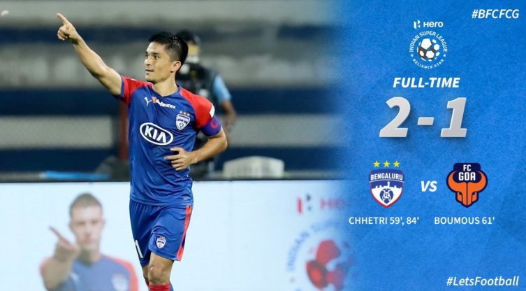 ഇന്ത്യൻ സൂപ്പർ ലീഗ് ഫുട്ബോളിന്റെ ആറാം സീസണിൽ ഇന്നലെ നടന്ന ബംഗളുരു-ഗോവ മത്സരത്തിൽ ബംഗളൂരു എഫ് സിക്ക് ജയം. ഇന്നലെ നടന്ന മത്സരത്തിൽ ശക്തരായ ഗോവയെ ഒന്നിനെതിരെ രണ്ട് ഗോളുകൾക്കാണ് ബംഗളൂരു എഫ് സി തോൽപ്പിച്ചത്. രണ്ടാം പകുതിയിൽ ആണ് മൂന്ന് ഗോളുകളും പിറന്നത്. ബംഗളൂരു എഫ് സിക്ക് വേണ്ടി സുനിൽ ഛേത്രിയാണ് രണ്ട് ഗോളുകളും നേടിയത്. ഹ്യൂഗോ ബൗമസ് ആണ് ഗോവയ്ക്ക് വേണ്ടി ഗോൾ നേടിയത്.