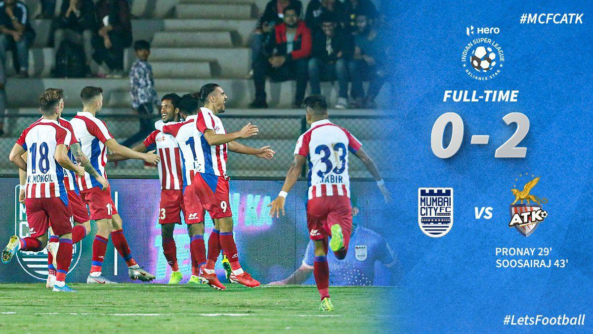 ഇന്ത്യൻ സൂപ്പർ ലീഗ് ഫുട്‌ബോളിന്റെ ആറാം സീസണിൽ ഇന്നലെ നടന്ന മത്സരത്തിൽ എ ടി കെ മുംബൈ സിറ്റിയെ തോൽപ്പിച്ചു. ജയത്തോടെ അവർ പോയിന്റ് നിലയിൽ ഒന്നാമതെത്തി. മുംബൈയുടെ ഹോം ഗ്രൗണ്ടിൽ എതിരില്ലാത്ത രണ്ട് ഗോളുകൾക്കാണ് എടികെ ജയിച്ചത്. തകർപ്പൻ പ്രകടനമാണ് കൊൽക്കത്ത നടത്തിയത്. ആദ്യ പകുതിയിൽ ആണ് അവർ രണ്ട് ഗോളും നേടിയത്. പ്രണോയ് ഹാള്‍ദർ, സൂസൈരാജ് എന്നിവരാണ് കൊൽക്കത്തയ്ക്ക് വേണ്ടി ഗോളുകൾ നേടിയത്. തുടർച്ചയായ നാല് ജയങ്ങൾക്ക് ശേഷമാണ് മുംബൈ ഇനങ്ങളെ തോറ്റത്.