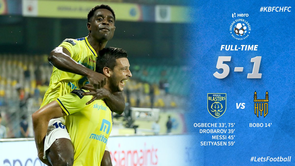 ബര്തലോമി ഒഗ്ബാചെ,റാഫേല് മെസി ബൗളി, പ്രതിരോധക്കാരന് വ്ളാഡ്കോ ഡ്രോബറോവ്, സെയ്ത്യാസെന് സിങ് എന്നിവരാണ് ഗോളുകൾ നേടിയത്. നായകൻ ഒഗ്ബാചെ രണ്ട് ഗോളുകൾ നേടി. ഹൈദരാബാദ് എഫ്സിയുടെ പ്രതിരോധ ബലഹീനതകളെ മുതലാക്കിയാണ് കേരളം കളിച്ചത്.33-ാം മിനിറ്റിൽ ആണ് കേരളം ഗോൾ വേട്ട തുടങ്ങിയത്. 33,39,45,59,65 എന്നീ മിനിറ്റുകളിലാണ് ഗോൾ പിറന്നത്. ഇതോടുകൂടി പതിനൊന്നു മത്സരങ്ങളിൽ നിന്നായി പതിനൊന്നു പോയിന്റുകൾ നേടി കേരളാ ബ്ലാസ്റ്റേഴ്സ് ഏഴാം സ്ഥാനത്തേക്കുയർന്നു. അടുത്ത മത്സരത്തിൽ, ജനുവരി പന്ത്രണ്ടാം തീയതി കൊൽക്കത്ത വിവേകാനന്ദ യുബ ഭാരതി കിരംഗൻ സ്റ്റേഡിയത്തിൽ കേരളാ ബ്ലാസ്റ്റേഴ്സ് എടികെയെ നേരിടും.