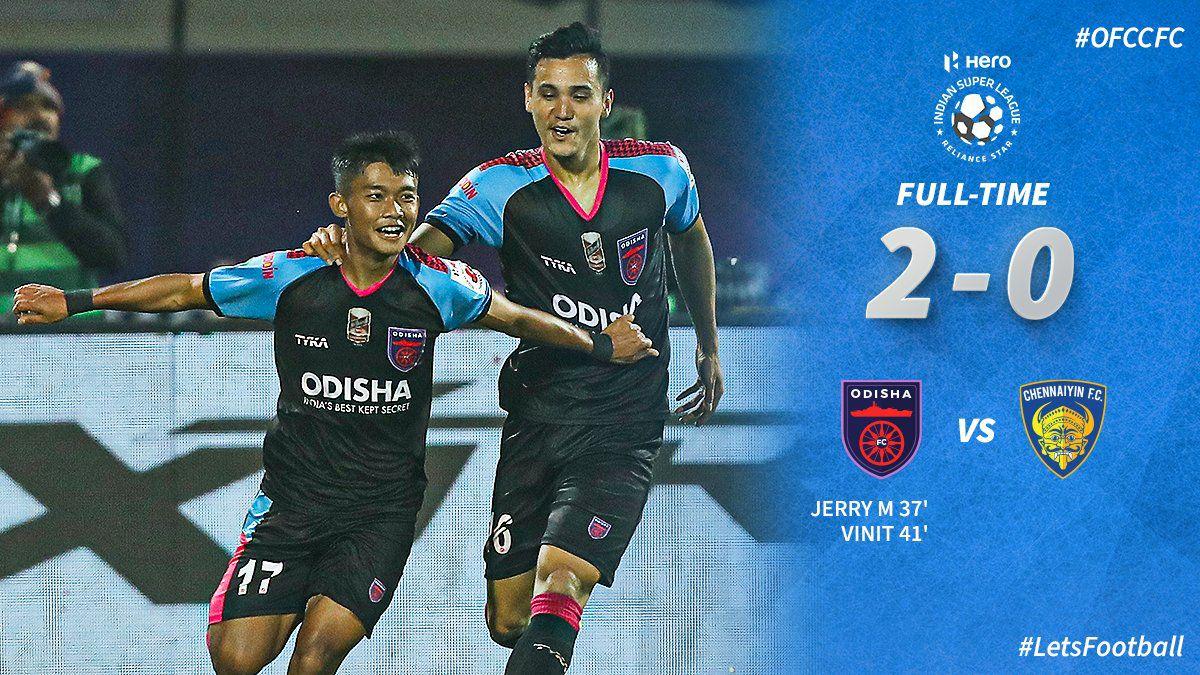 ഇന്ത്യൻ സൂപ്പർ ലീഗ് ഫുട്ബോളിന്റെ ആറാം സീസണിൽ ഇന്നലെ നടന്ന മൽസരത്തിൽ ഒഡീഷക്ക് തകർപ്പൻ ജയം. ചെന്നൈയിനെ എതിരില്ലാത്ത രണ്ട് ഗോളുകൾക്കാണ് തോൽപ്പിച്ചത്. സ്വന്തം ഗ്രൗണ്ടിലെ ഒഡീഷയുടെ രണ്ടാം ജയമാണ് ഇന്നലെ നേടിയത്. ആദ്യ പകുതിയിൽ നൗ രണ്ട് ഗോളുകളും പിറന്നത്. ജെറിയും (37) വിനിത് റായ്യും (41) ആണ് ഒഡീഷക്ക് വേണ്ടി ഗോളുകൾ നേടിയത്.