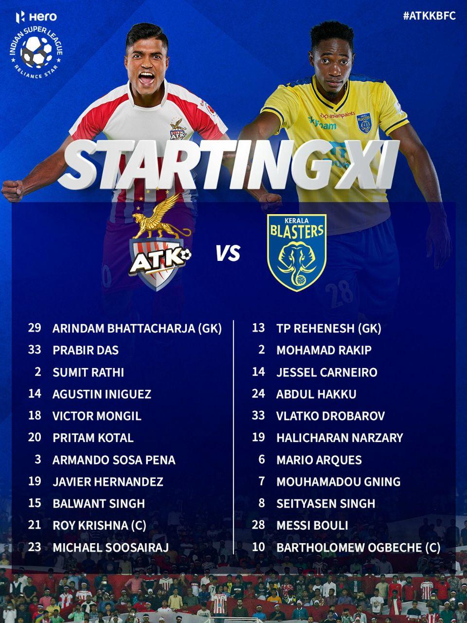 ഐഎസ്എൽ: എടികെ എഫ് സി കേരള ബ്ലാസ്റ്റേഴ്സ് എഫ് സി ടീമുകളുടെ സ്റ്റാർട്ടിങ് ഇലവനെ പ്രഖ്യാപിച്ചു