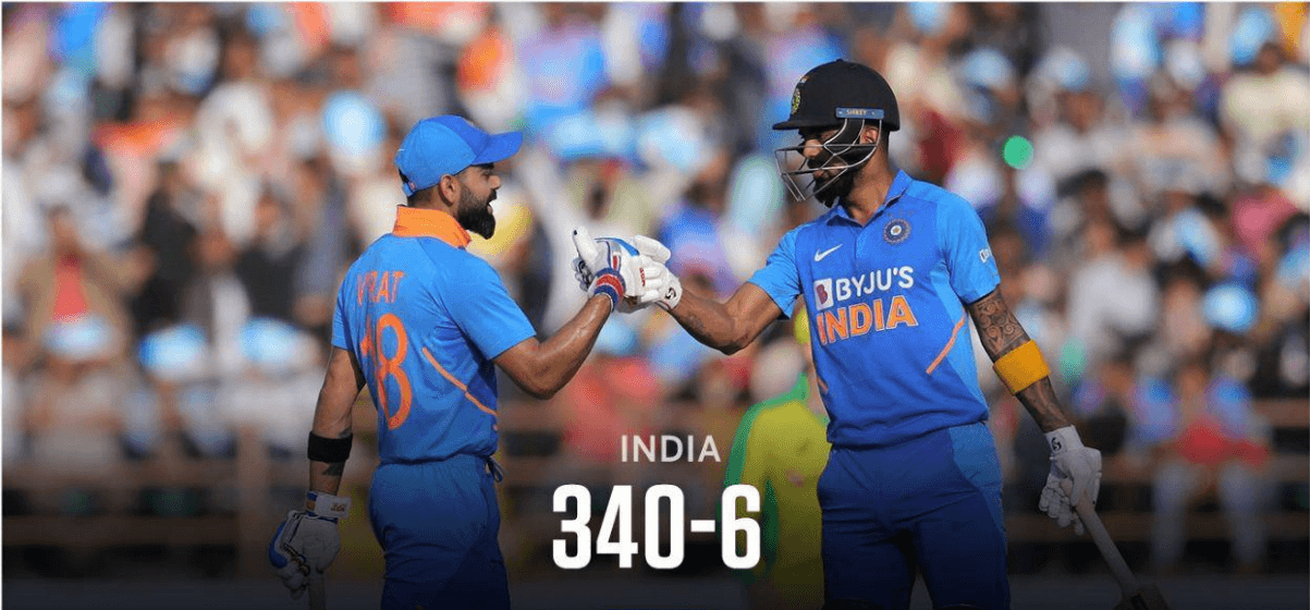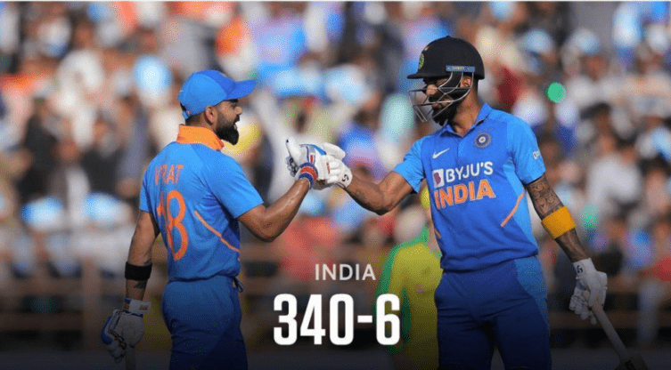 രോഹിത്തും ധവാനും ഇന്ത്യക്ക് മികച്ച തുടക്കമാണ് നൽകിയത്. ഒന്നാം വിക്കറ്റിൽ ഇരുവരും ചേർന്ന് 81 റൺസ് ആണ് നേടിയത്. 44 പന്തില്‍ 42 റണ്‍സെടുത്ത രോഹിത് ശര്‍മ്മയെ ആദം സാംപയാണ് പുറത്താക്കിയത്. പിന്നീടെത്തിയ കോഹിലിയും ധവാനും ചേർന്ന് സ്‌കോർ മുന്നോട്ട് കൊണ്ടുപോയി. മികച്ച കൂട്ടുകെട്ടാണ് ഇരുവരും ചേർന്ന് നടത്തിയത്. രണ്ടാം വിക്കറ്റിൽ ഇരുവരും ചേർന്ന് 103 റൺസ് ആണ് നേടിയത്. പിന്നീടെത്തിയ ശ്രേയസ് അയ്യർ പെട്ടെന്നു തന്നെ പുറത്തായി. നാലാമനായി എത്തിയ കെ എൽ രാഹുലുമായി ചേർന്ന് കൊഹ്‌ലിയെ ഇന്ത്യയുടെ സ്‌കോർ മുന്നോട്ട് കൊണ്ടുപോയി. നാലാം വിക്കറ്റിൽ 74 റൺസ് ഇരുവരും ചേർന്ന് നേടി. അവസാന ഓവറുകളിൽ രാഹുൽ നടത്തിയ വെടിക്കെട്ട് ബാറ്റിംഗ് ആണ് സ്‌കോർ 340ൽ എത്തിയത്. ആദ്യ മൽസരത്തിൽ ബാറ്റിങ്ങിൽ പരാജയപ്പെട്ട ഇന്ത്യക്ക് രണ്ടാം മത്സരത്തിൽ മികച്ച പ്രകടനം നടത്താൻ കഴിഞ്ഞു. ഓസ്‌ട്രേലിയക്ക് വേണ്ടി ആദം സാംപ മൂന്ന് വിക്കറ്റ് നേടി.