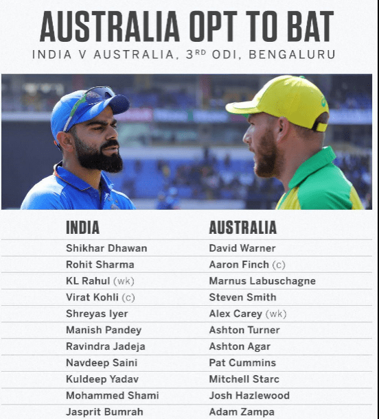 ഓസ്ട്രേലിയ ഇന്ത്യ ഏകദിന പരമ്പരയിലെ മൂനാം ഏകദിനം ഇന്ന് ആരംഭിച്ചു. ടോസ് നേടിയ ഓസ്ട്രേലിയ ബാറ്റിങ്ങ് തിരഞ്ഞെടുത്തു. മൂന്ന് ഏകദിനത്തിനത്തിലും ഓസ്ട്രേലിയക്കാണ് ടോസ് ലഭിച്ചത്. ഇന്ത്യൻ ടീമിൽ യാതൊരു മാറ്റവും ഇല്ല. രണ്ടാം ഏകദിനത്തിനറങ്ങിയ അതേ ടീം ആണ് ഇന്നും. ഓസ്ട്രേലിയൻ ടീമിൽ ജോഷ് ഹെയ്സൽവുഡ് ഇന്ന് കളിക്കുന്നുണ്ട്.